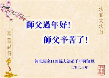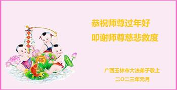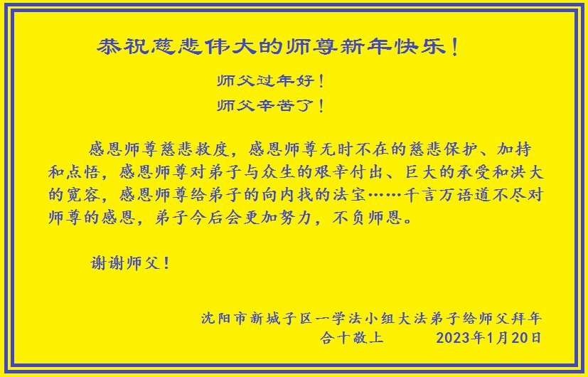 【明慧网二零二三年一月二十三日】(明慧网记者综合报道)走入古稀、耄耋、人瑞之年的大法弟子们,在法轮大法真、善、忍的教导下,性命双修,身体健康,精神饱满,走在返本归真、救度众生的修炼路上。癸卯大年来临,老年大法弟子们感谢师尊的救度与保护,恭祝师尊过年好!