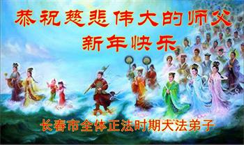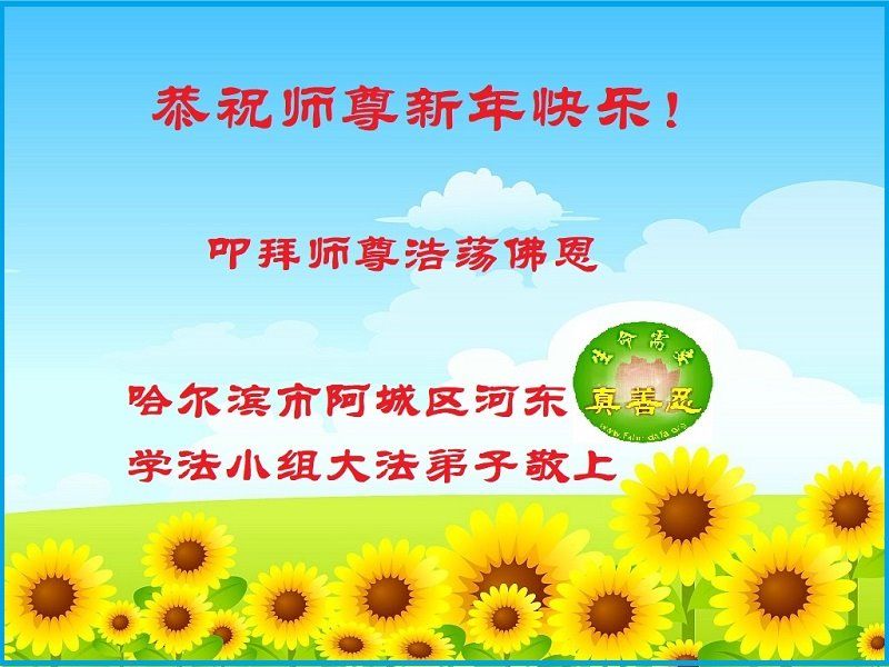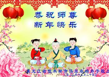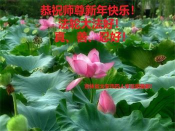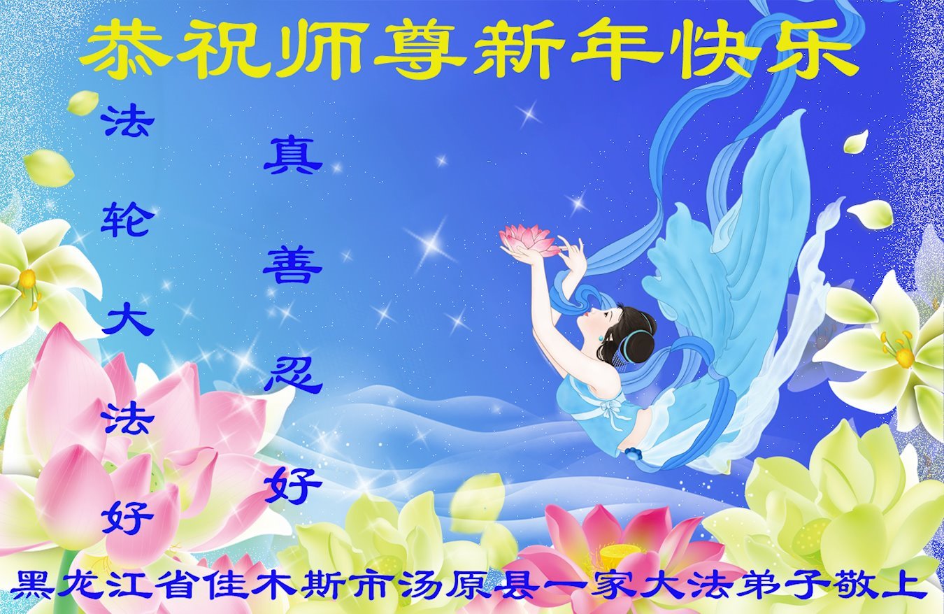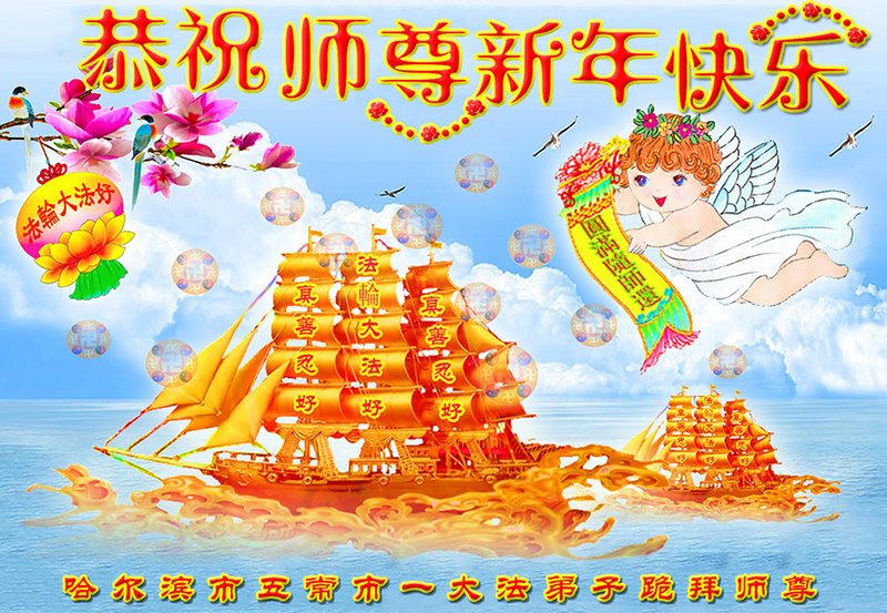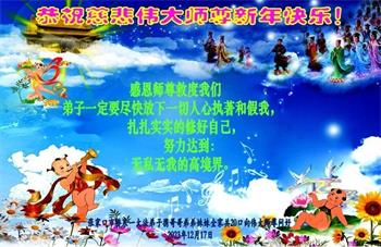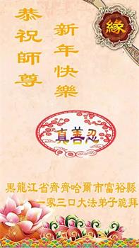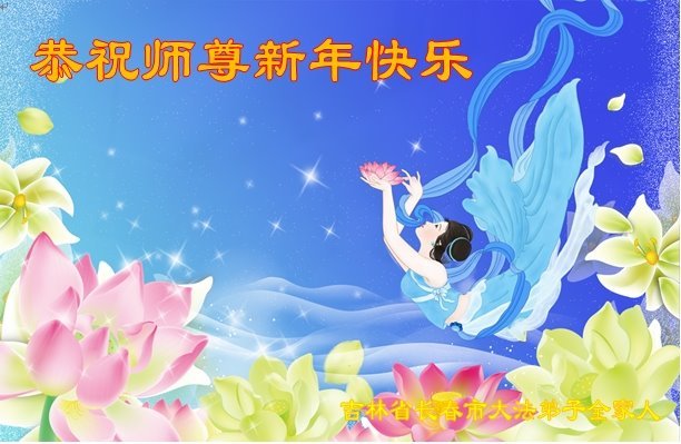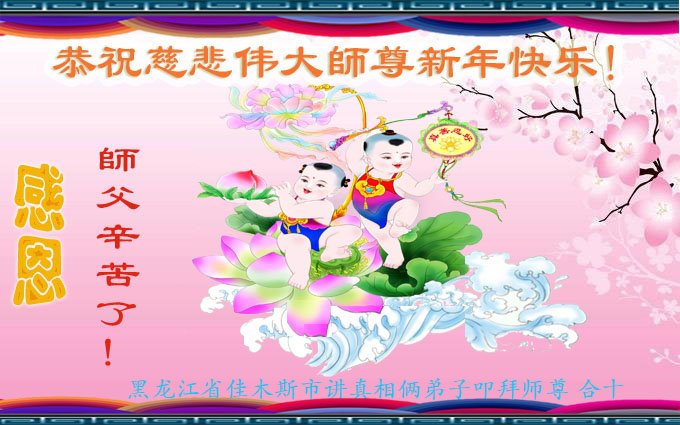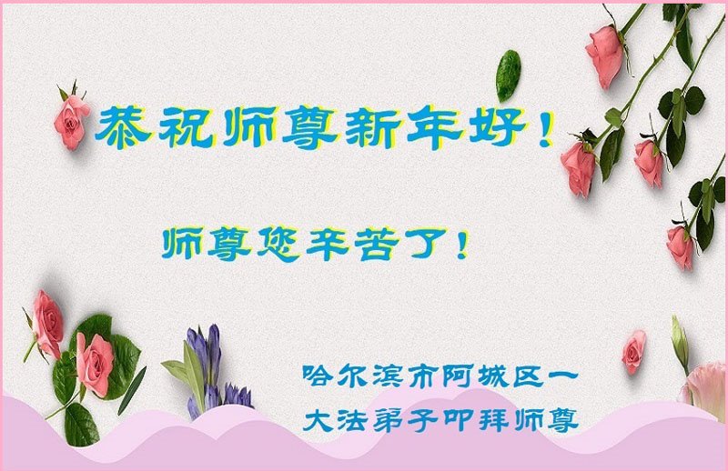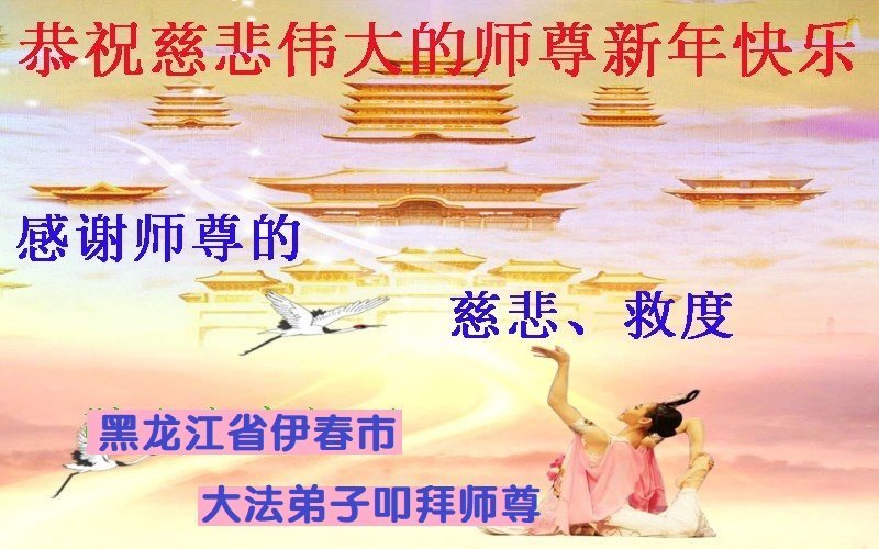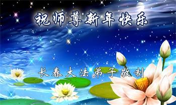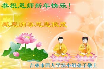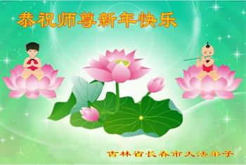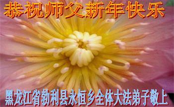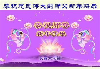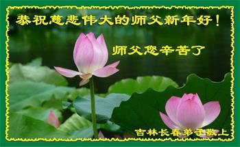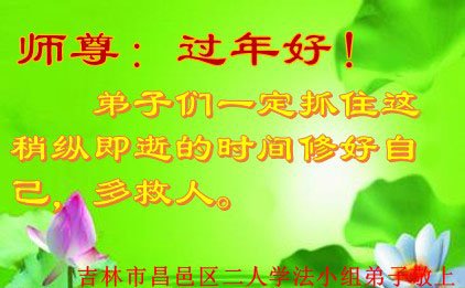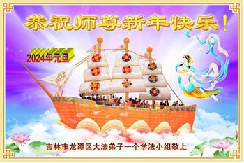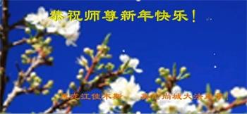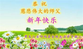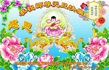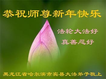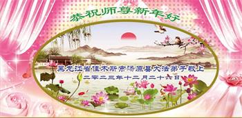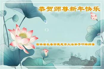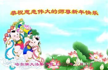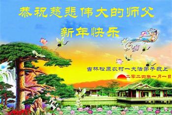 黑龙江省公安系统大法弟子在贺词中表示:“二十五年修炼的风风雨雨,弟子们都坚持下来了。请师父放心,在新的一年,弟子们一定会做的更好,勇猛精進,助师正法。”