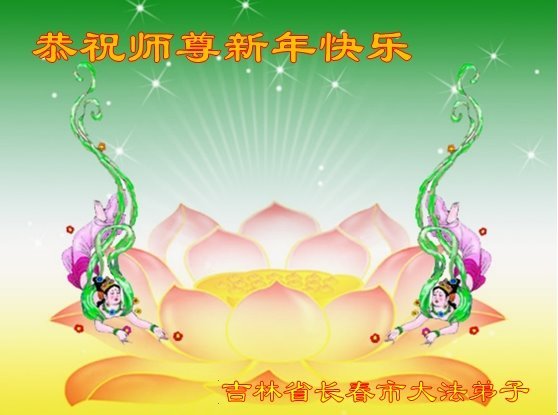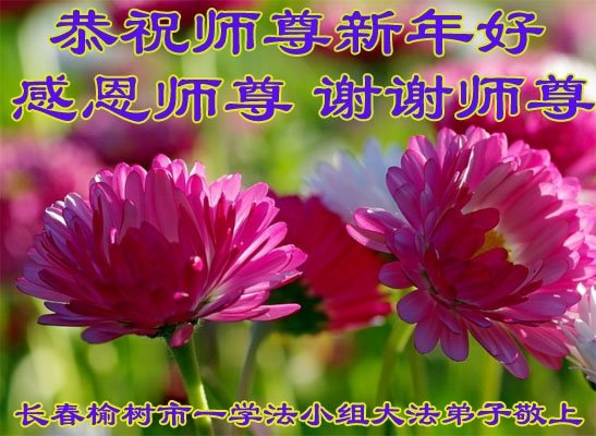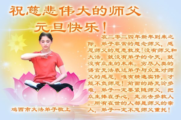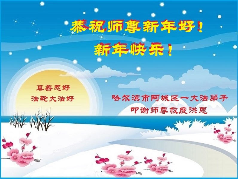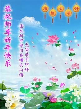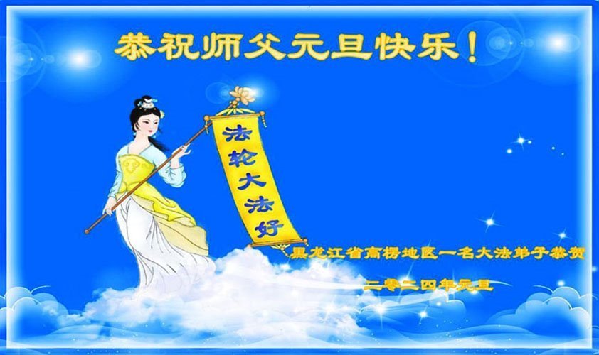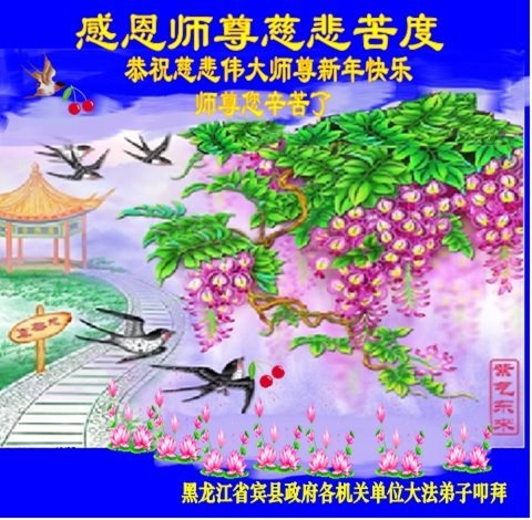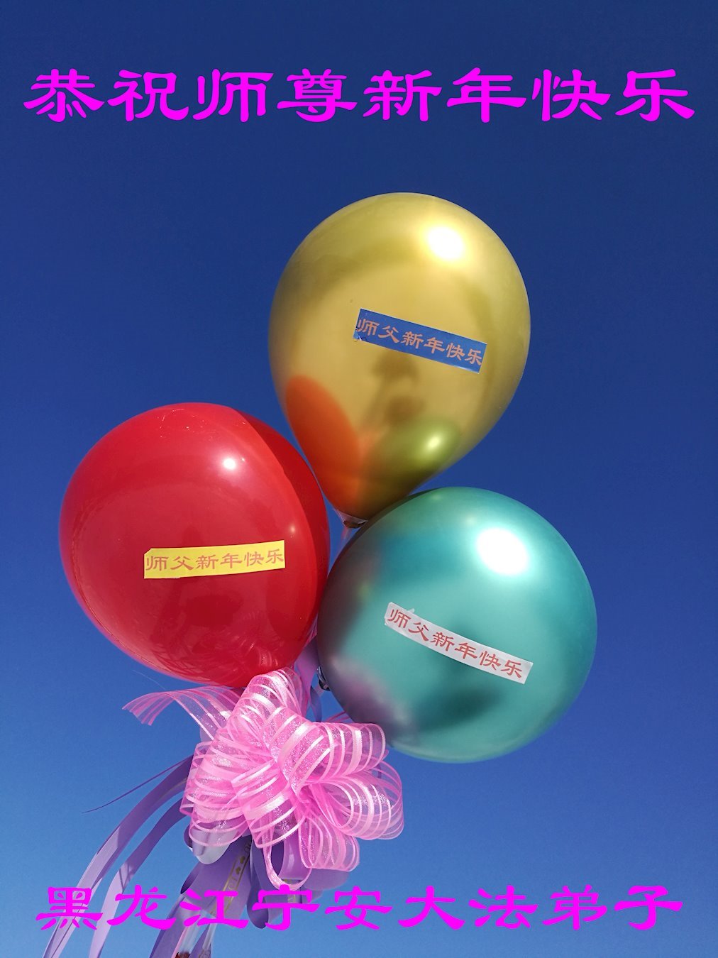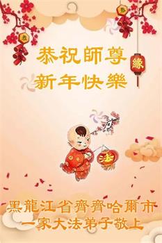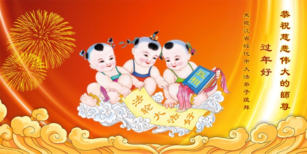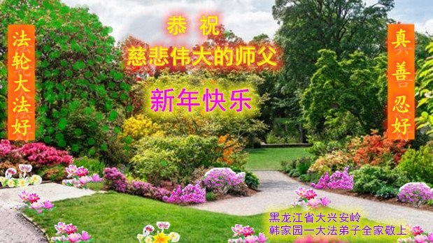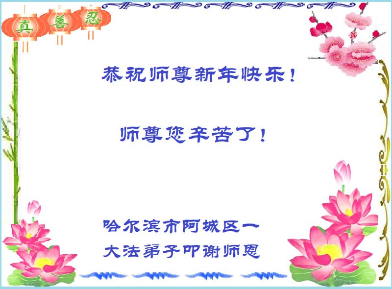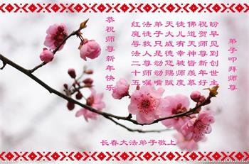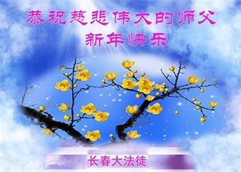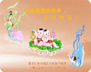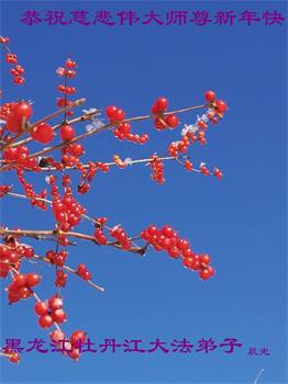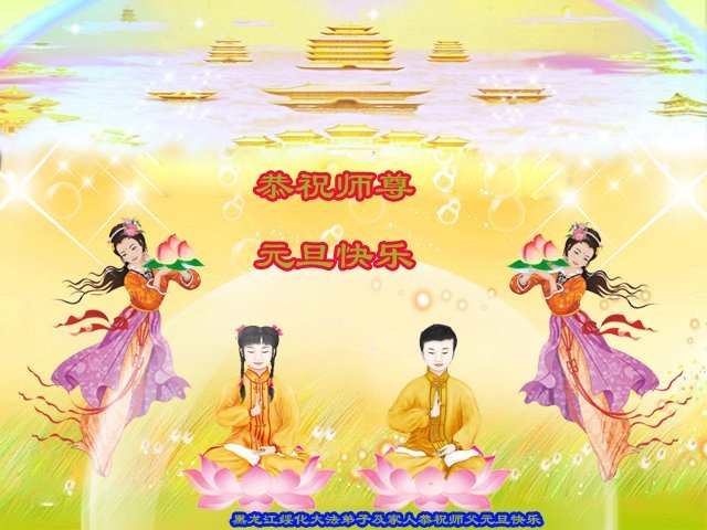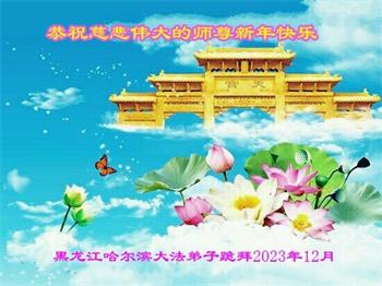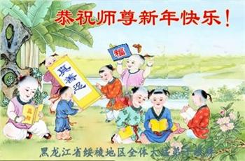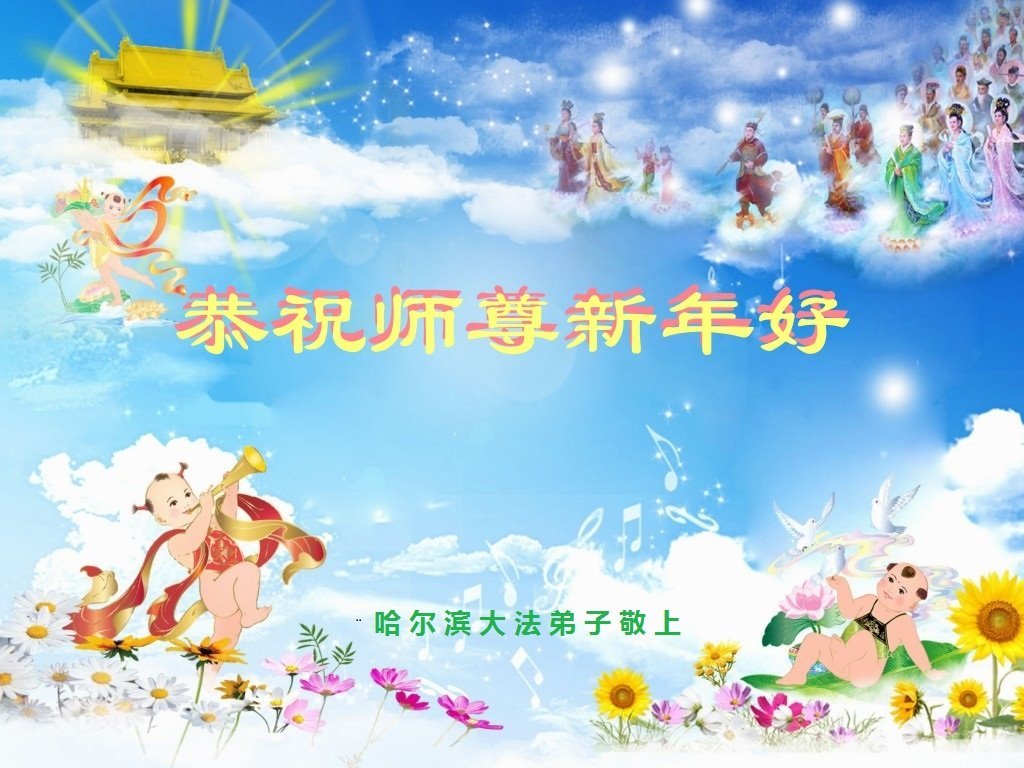 黑龙江省公安系统大法弟子在贺词中表示:“二十五年修炼的风风雨雨,弟子们都坚持下来了。请师父放心,在新的一年,弟子们一定会做的更好,勇猛精進,助师正法。”