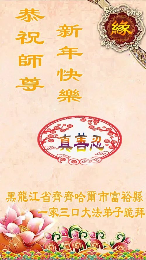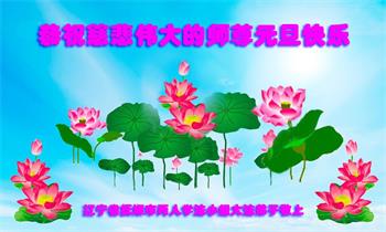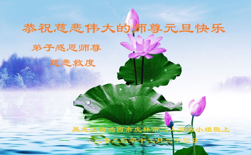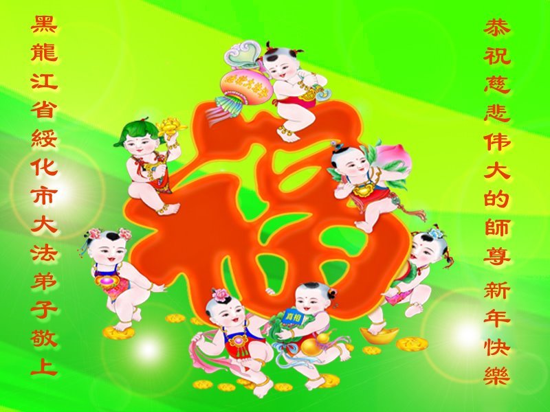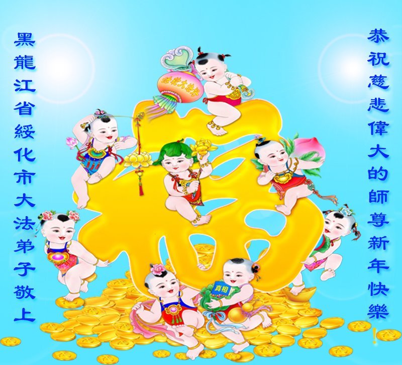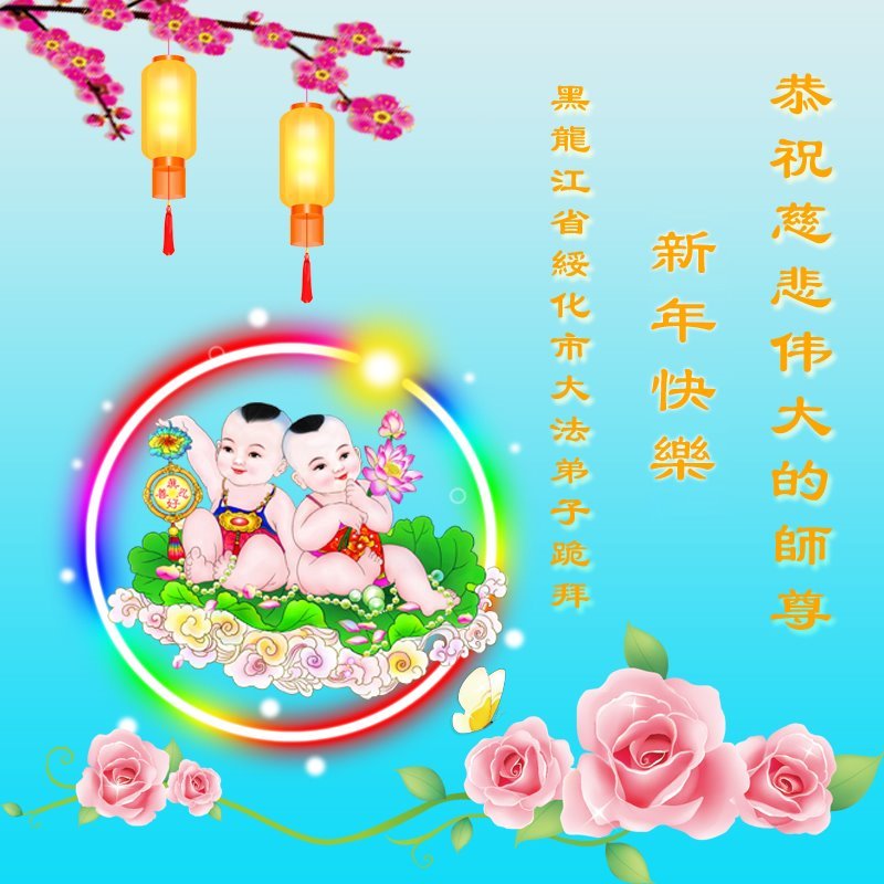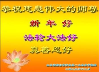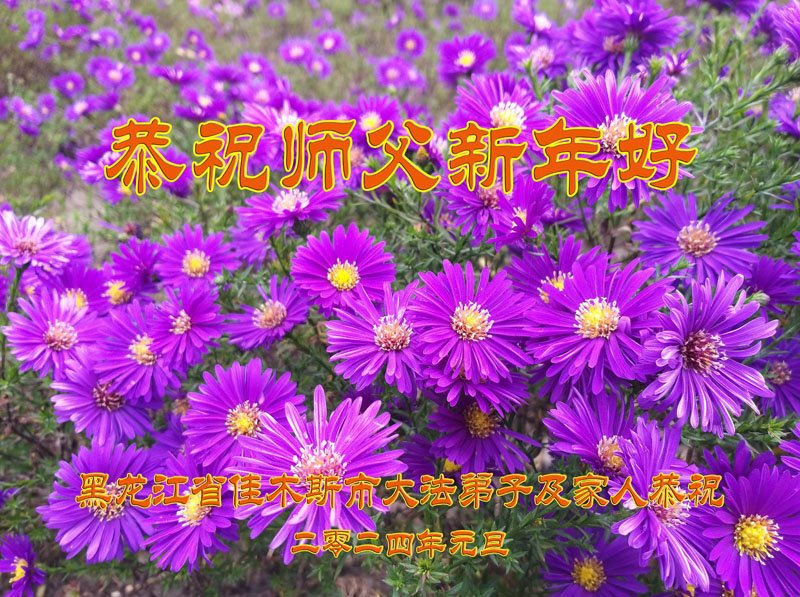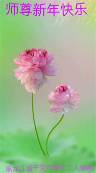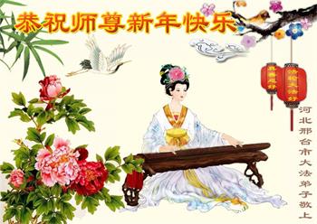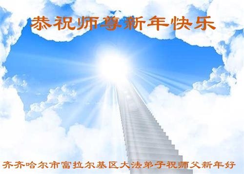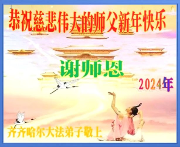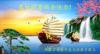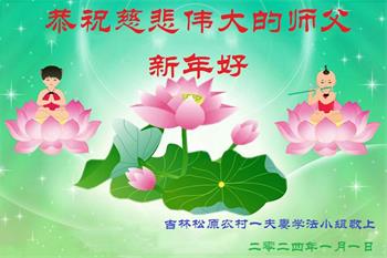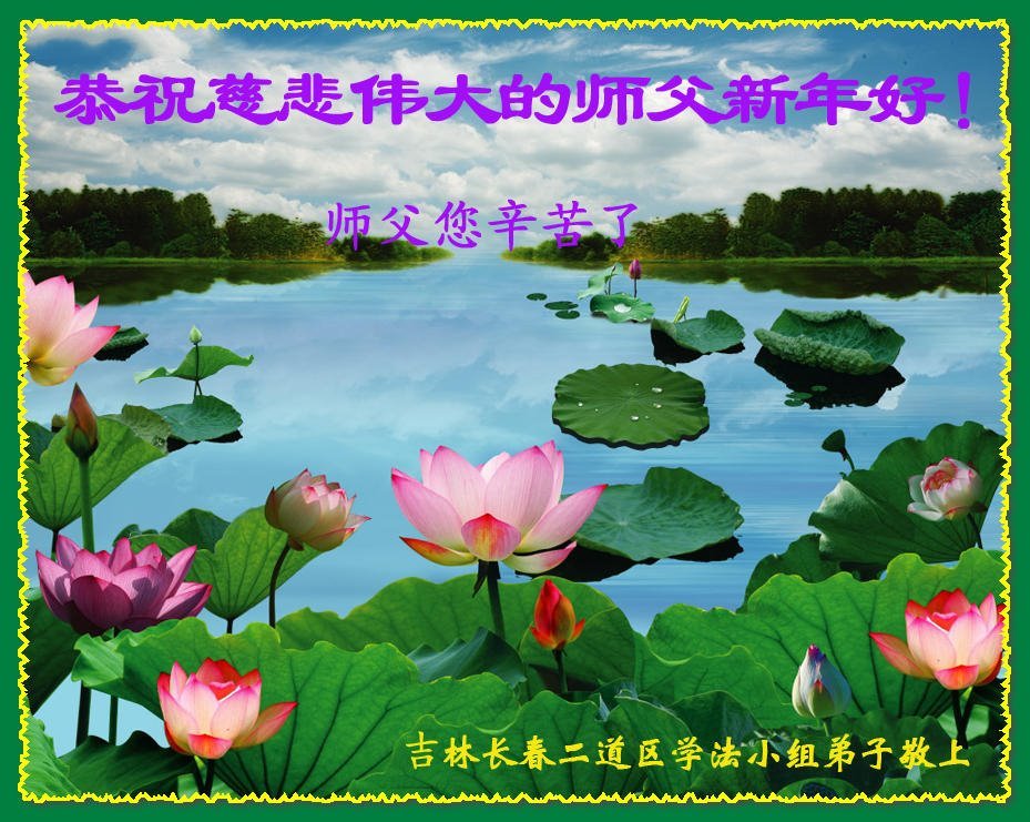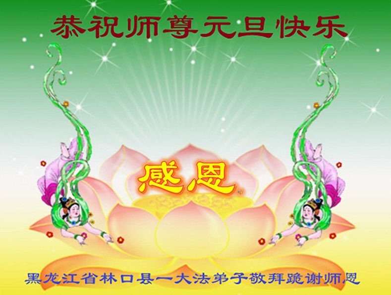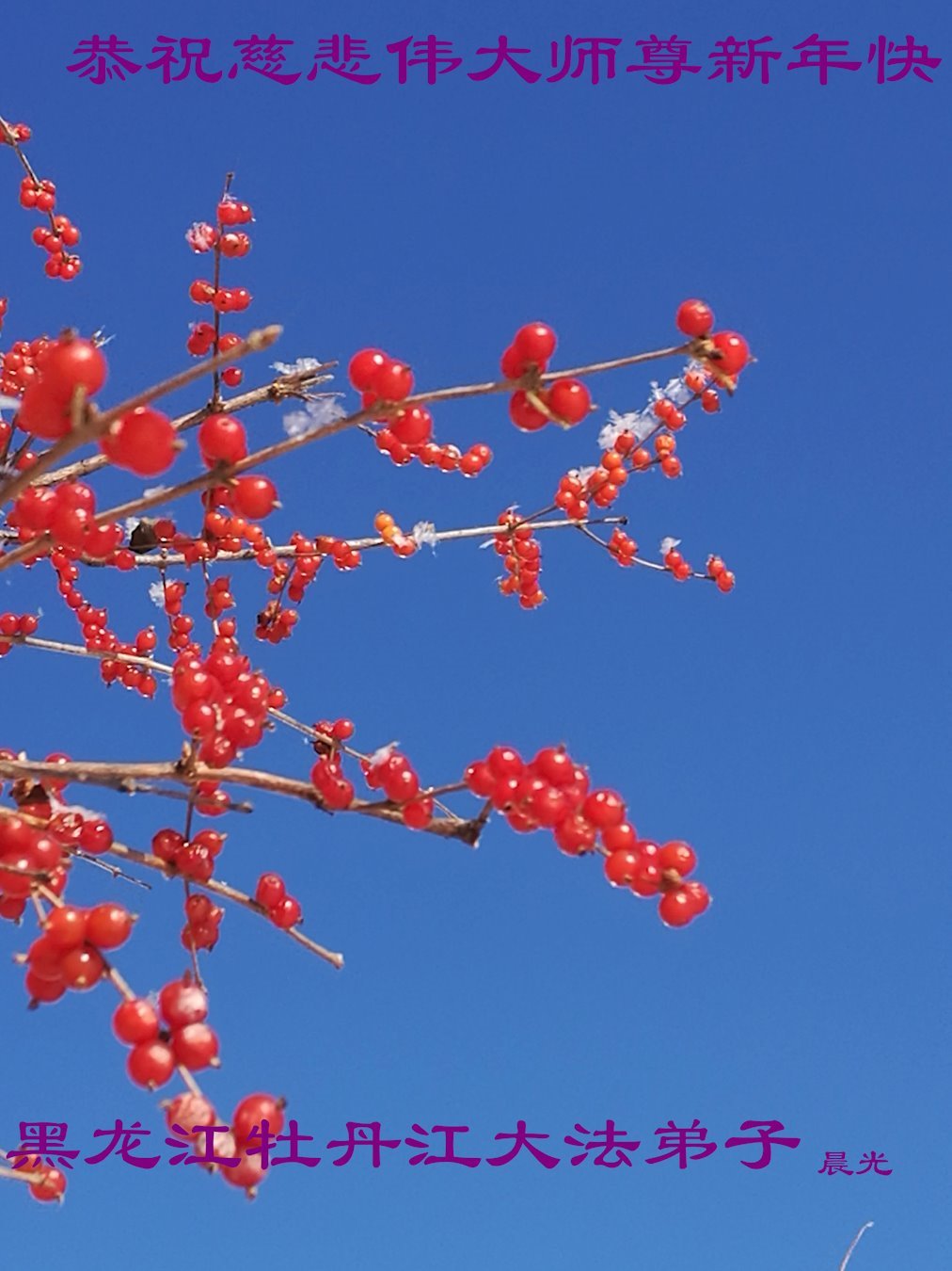 黑龙江省公安系统大法弟子在贺词中表示:“二十五年修炼的风风雨雨,弟子们都坚持下来了。请师父放心,在新的一年,弟子们一定会做的更好,勇猛精進,助师正法。”
