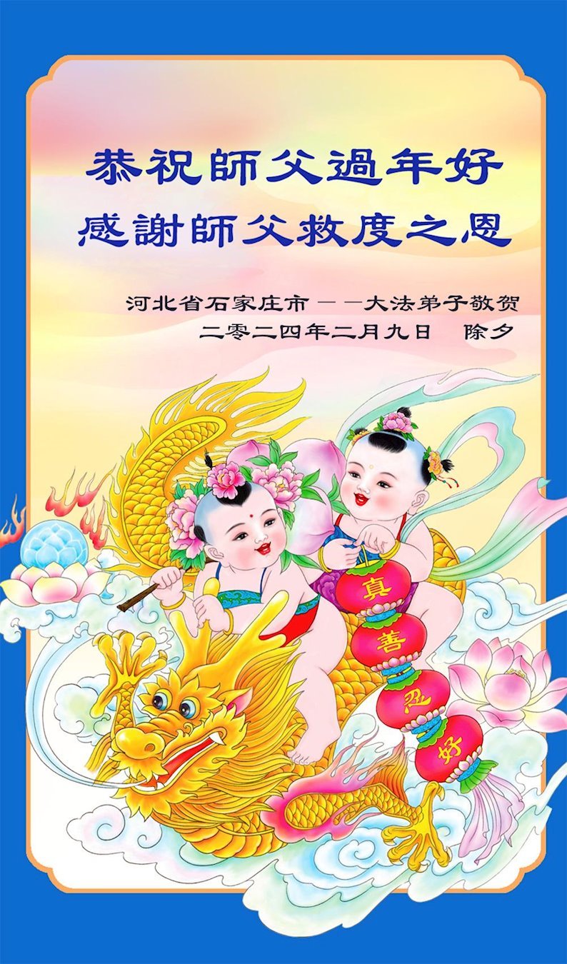【明慧网二零二四年二月十三日】(明慧网记者综合报道)随着师尊正法洪势的推進,更多的众生在觉醒。尽管走向末路的中共还在迫害法轮功,也挡不住明白真相、有缘的民众入道得法,走上返本归真之路。二零二四年过年期间,华北、东北、华东、中南、西南等中国各地区新入门的法轮大法学员诚敬的给李洪志师尊拜年!感谢师尊救度!