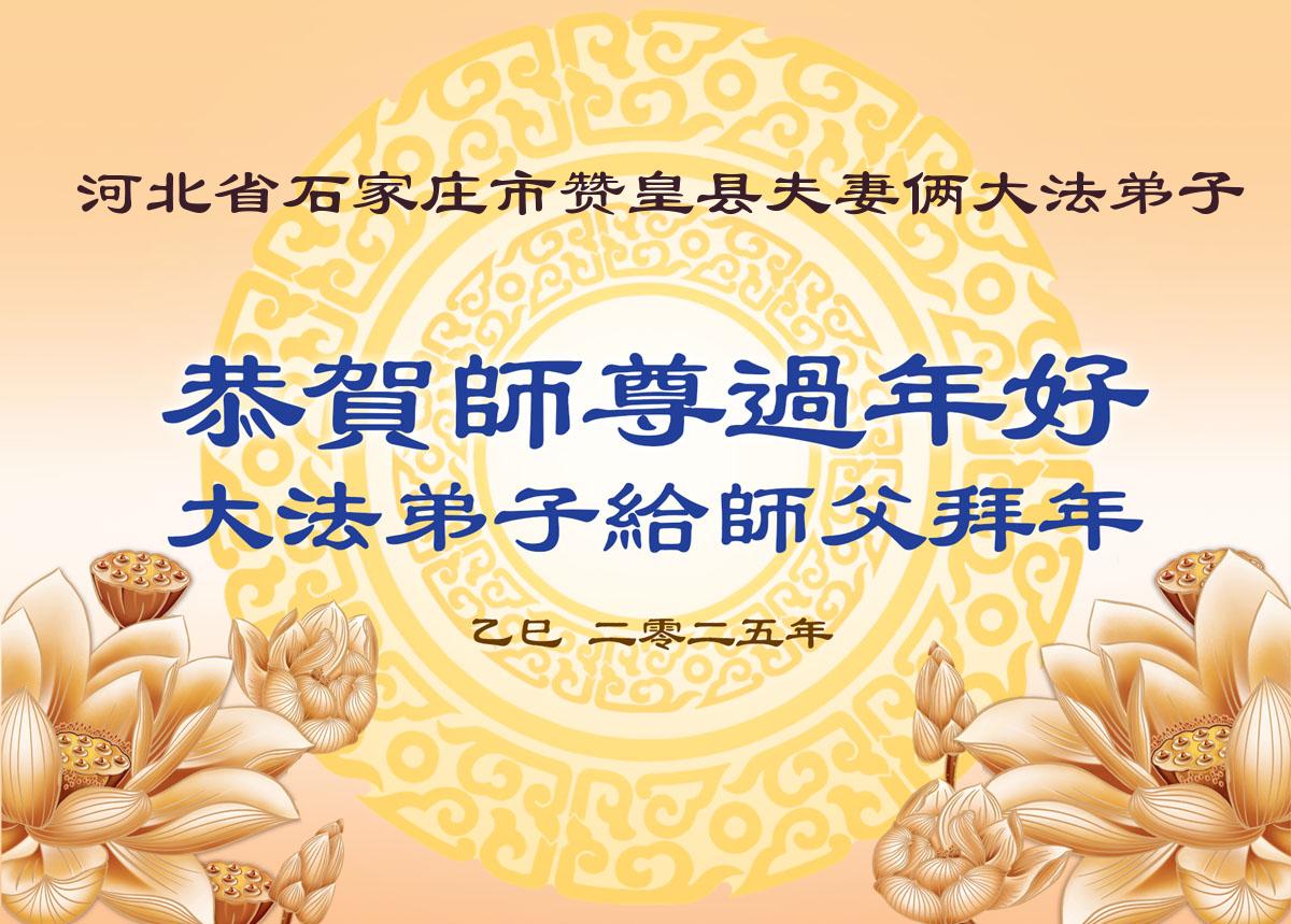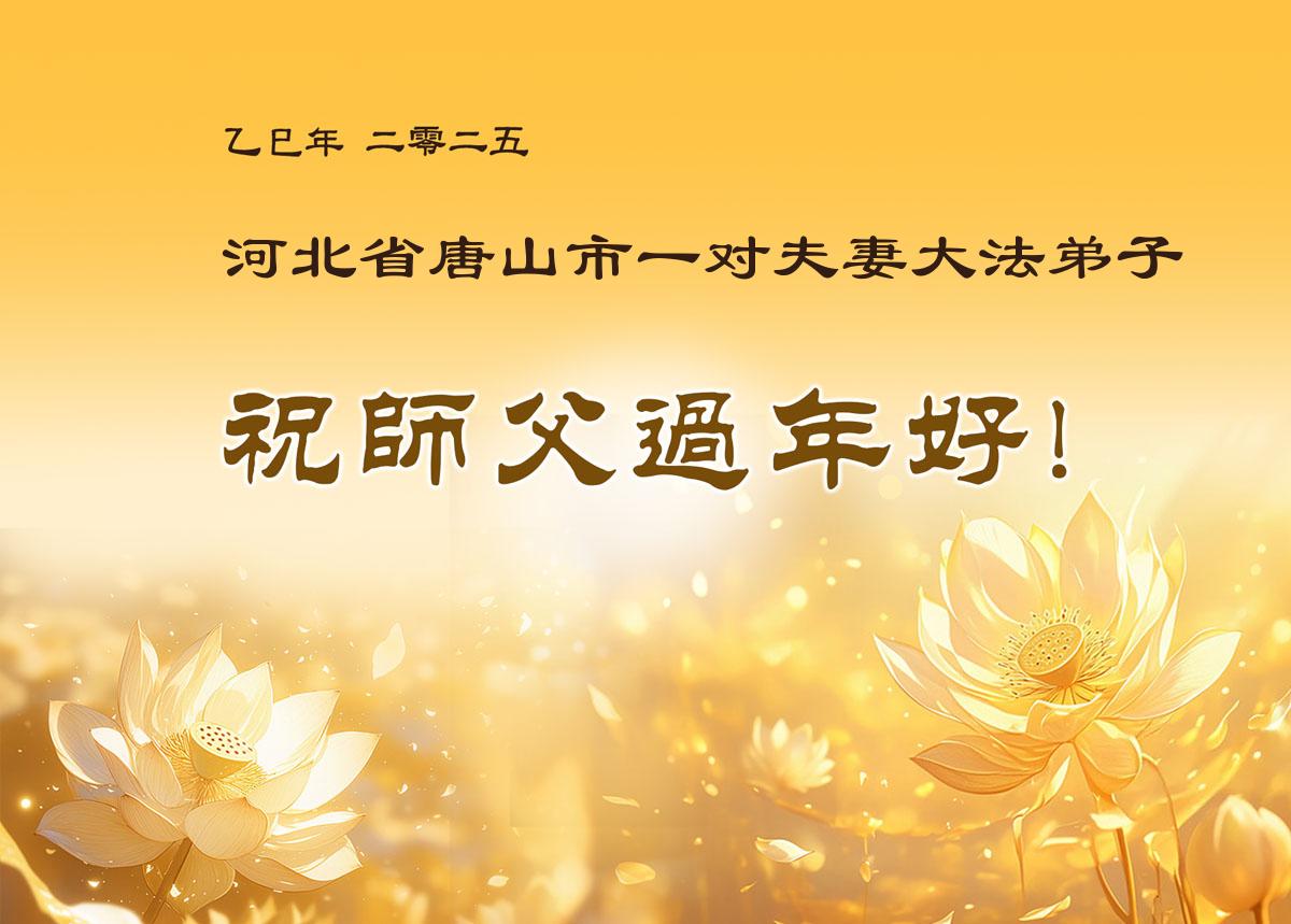 我们是明白真相的大法弟子家属。我们夫妻俩感谢李大师传大法,给我们带来了无量幸福。我们天天看真相,越看越愿意看。新年来临,我们给李大师拜年,李大师过年好!我们一定沿着正的能量前行。谢谢李大师!