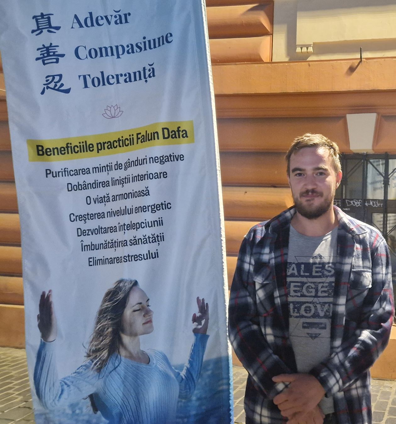 一位女士在特尔古穆列什药科大学(UMFST)路过法轮功展位时,收到了法轮功真相资料。她被法轮大法的道德原则深深打动,并表示这些原则正是人们所需要的。