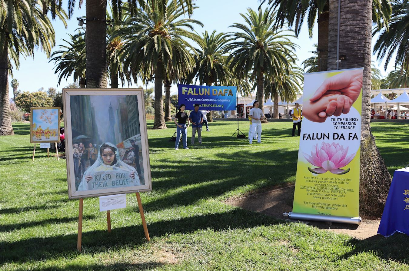 草坪上展示着“真善忍美展”的画作,有人驻足观看,有的人会停下来询问。两位妇女询问时,随行的女孩们去看画展,然后学着画中人物打坐的姿势坐下;有小学员过去教动作,她们离开时开心地拿着小莲花礼物。
