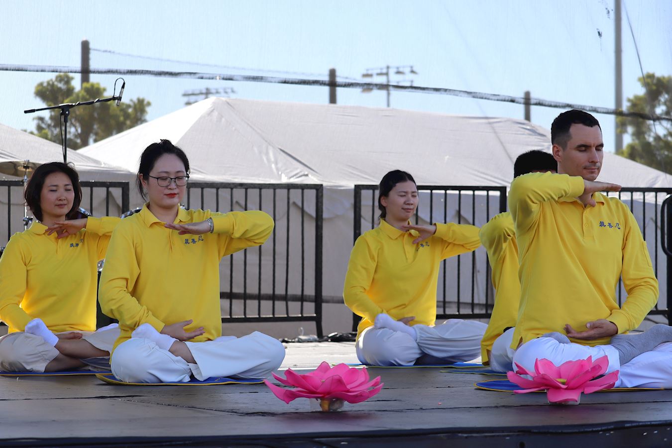 不仅在舞台上,在大公园主停车场对面的草坪以及公园入口附近,从上午到下午,不断地有法轮大法的学员前来向人们展示五套功法。