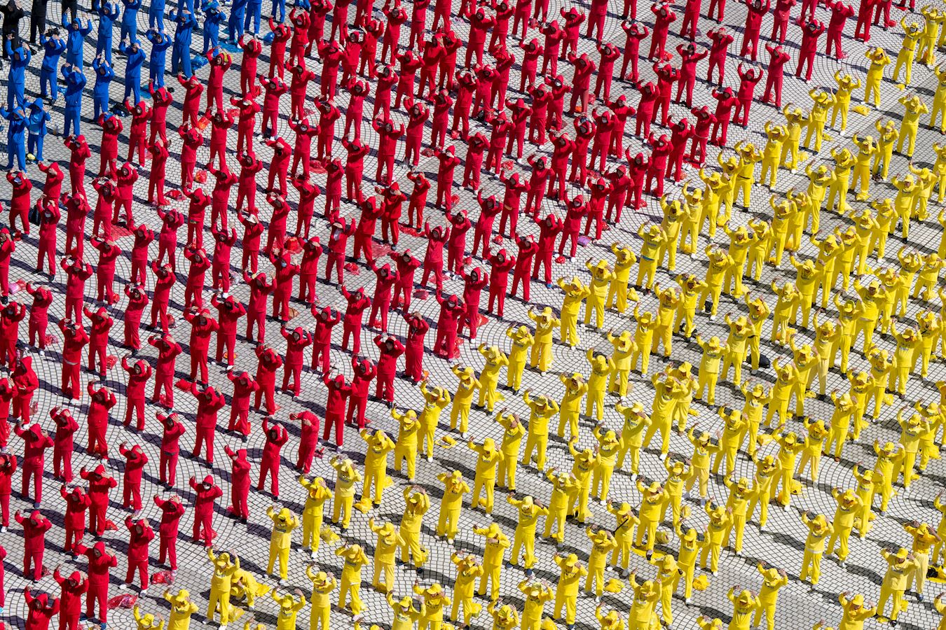 图3~4:五千名法轮功学员于排字结束后,举行集体炼功。