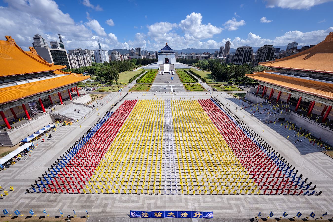 '图1:二零二五年十月十八日,约五千名法轮功学员在台北自由广场排字,排出历年来最大的法轮图形和“法轮常转”四字。'