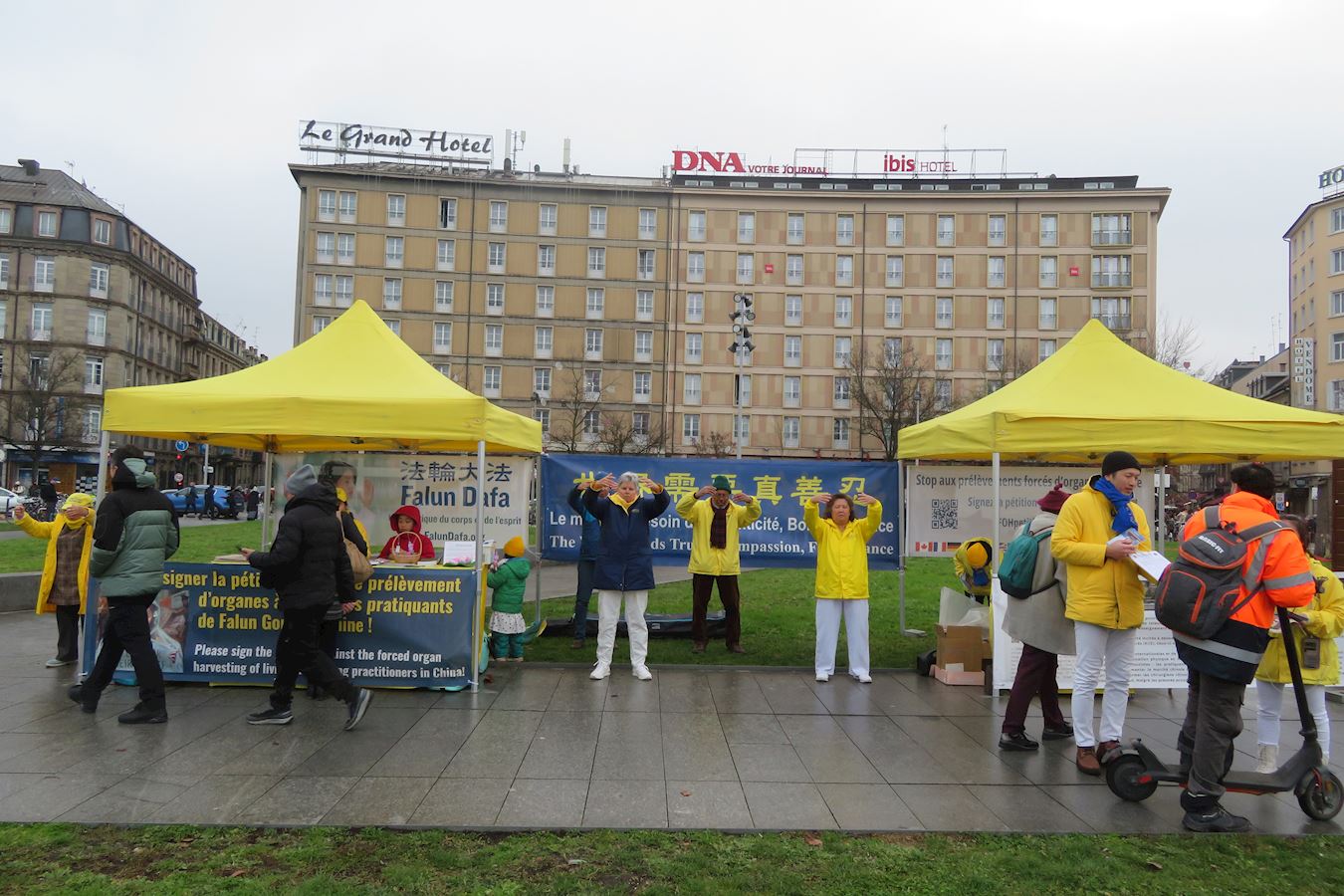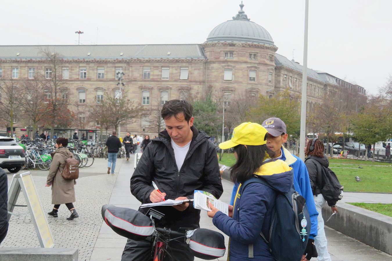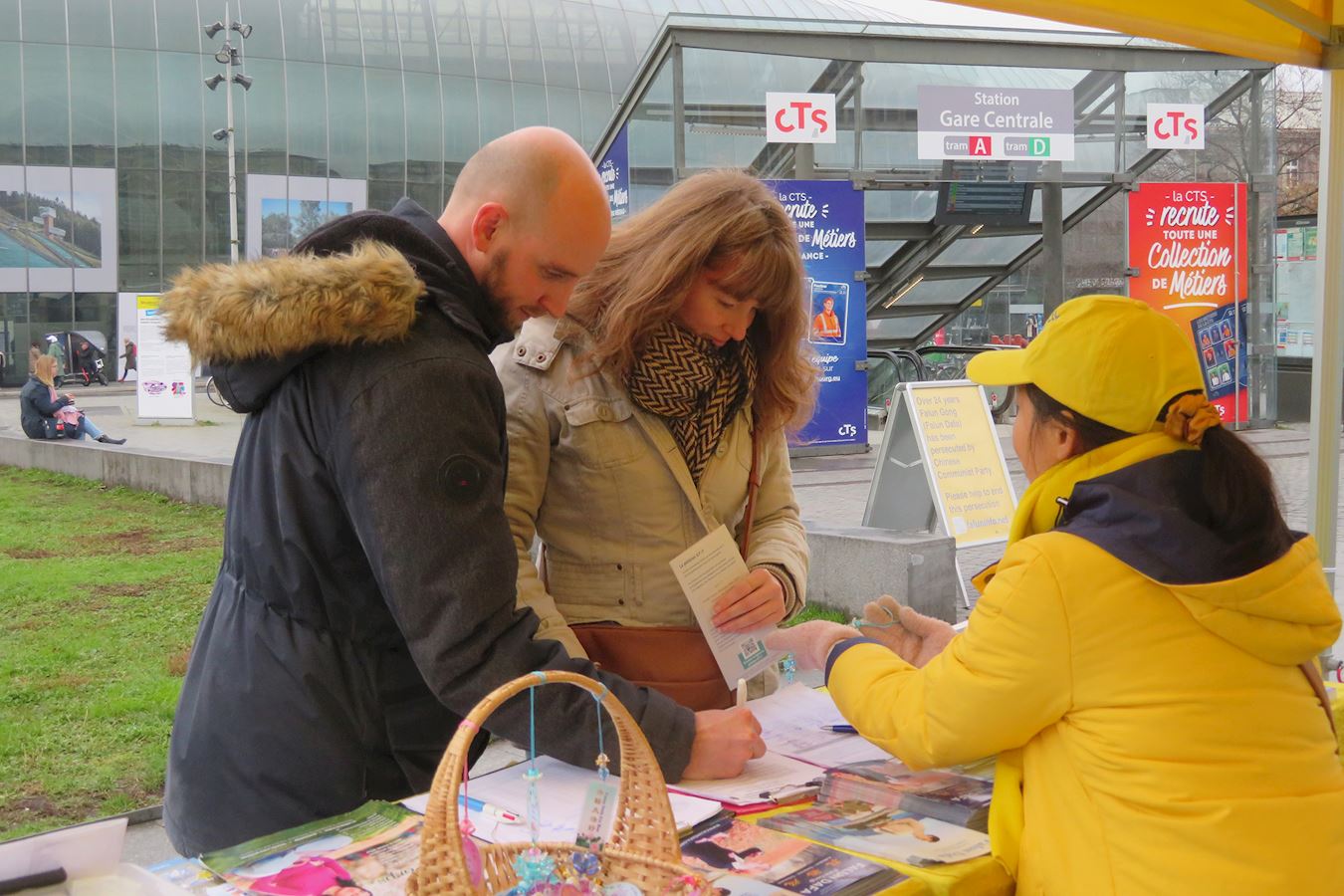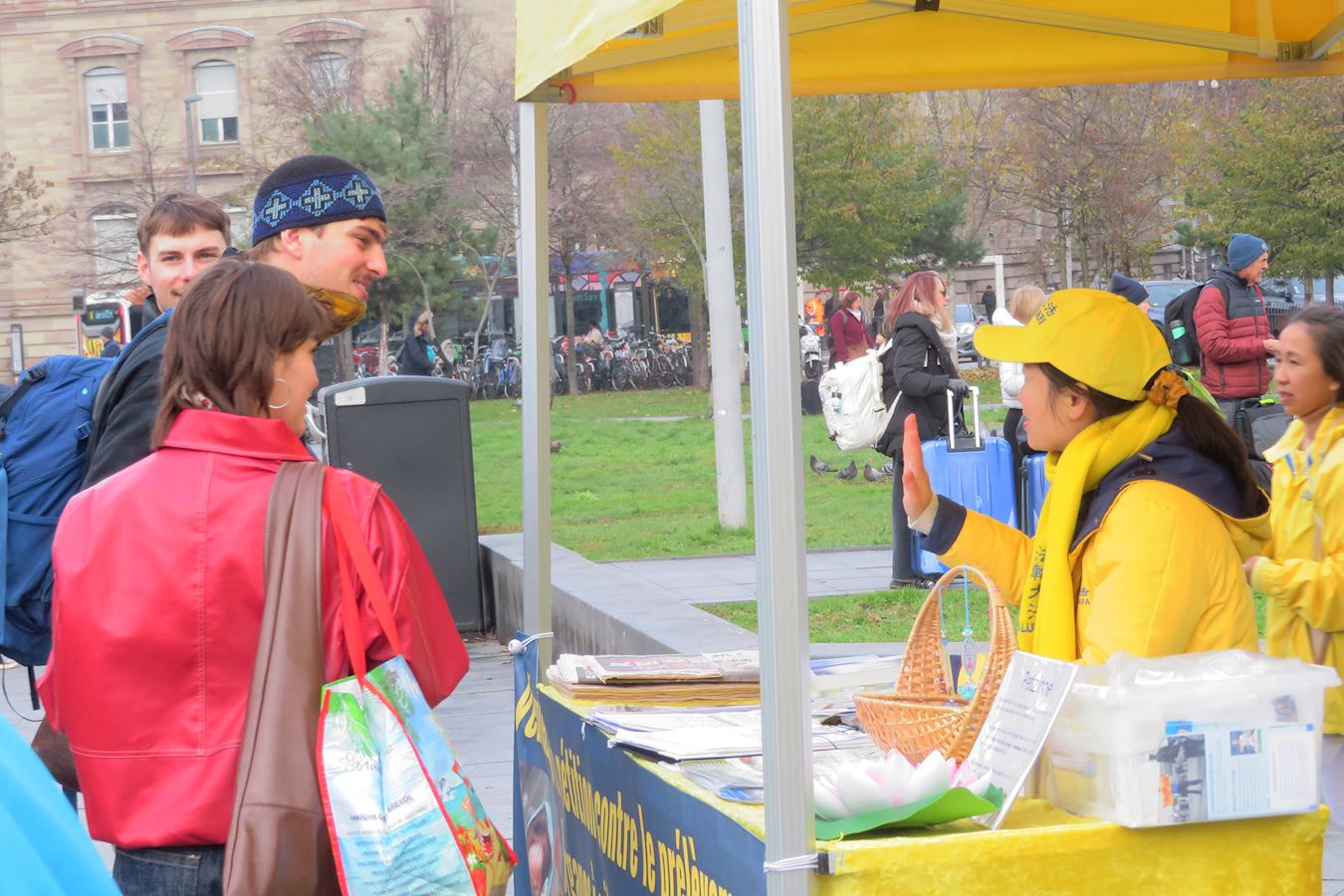 从十二月五日到十二月七日,法轮功学员来到斯特拉斯堡的火车站广场、奥斯特里茨广场(Place d’Austerlitz)和科尔博广场(Place du Corbeau),向人们介绍法轮功及真相。斯特拉斯堡的圣诞市场吸引了欧洲各地的游人,人们在观光游览的同时遇见了法轮功,了解法轮功真相,同时签名支持法轮功学员的反迫害行动。