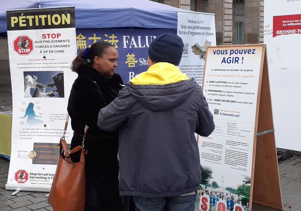 劳伦斯(Laurence)是生物研究员,在斯特拉斯堡接受培训后准备乘火车回家。她非常震惊:“我简直不敢相信。今天在车站看到你们才得知此事(活摘器官)。我完全不知道存在这种野蛮行径。希望此事能引起关注,让这种做法彻底停止。”