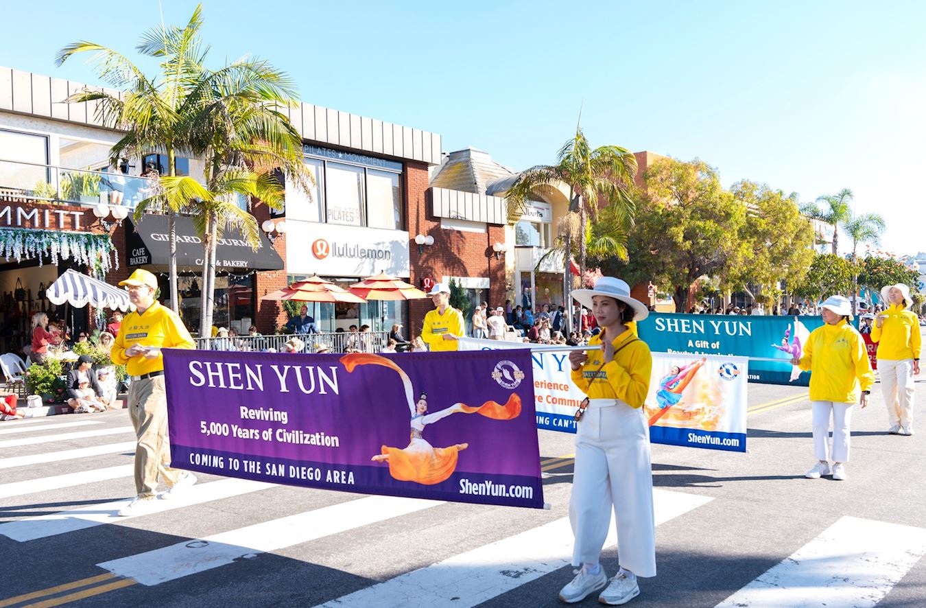 【明慧网二零二五年十二月十三日】二零二五年十二月七日,美国加州圣地亚哥法轮功学员参加了当地滨海社区拉荷亚的圣诞游行,传播法轮大法的美好和神韵艺术团即将在圣地亚哥演出的信息。主持人在介绍了法轮功的队伍后说:“谢谢神韵。我看过神韵,我非常喜欢,非常美,充满能量。”