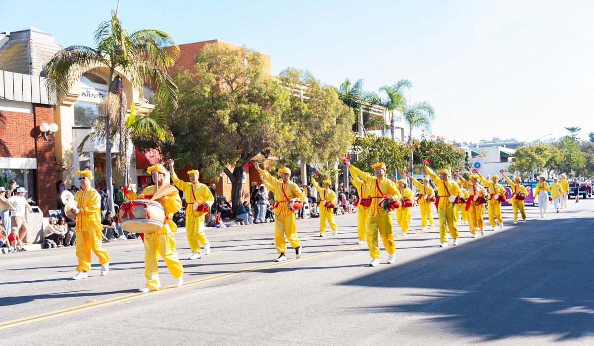 主办方在游行沿路设置了数个广播台,介绍游行队伍。他们这样介绍法轮功的队伍:“现在走来的是明亮而又欢快的法轮大法的队伍!法轮大法,亦称法轮功,是基于真善忍原理的、古老的精神修炼。今天,法轮功学员为游行带来中国传统的腰鼓表演,为我们增加节日庆祝的气氛。他们每年也都会邀请总部位于纽约的神韵艺术团来圣地亚哥,分享共产党之前的中国文化的美和智慧。”