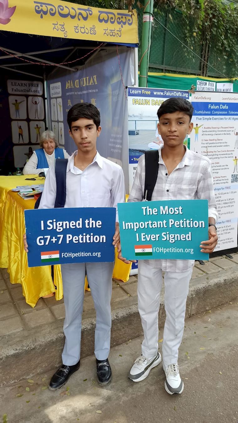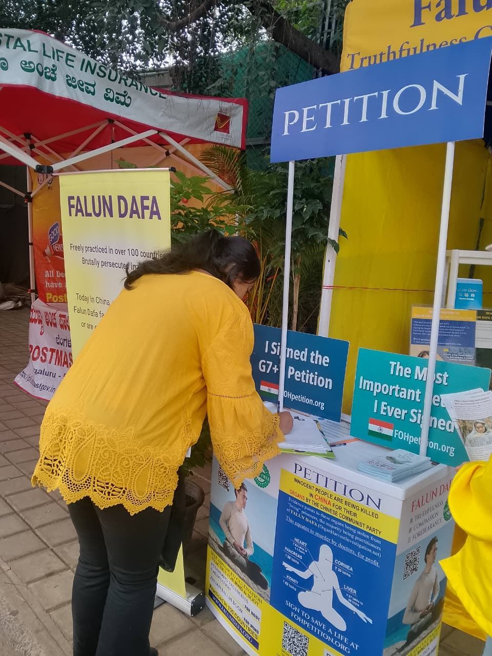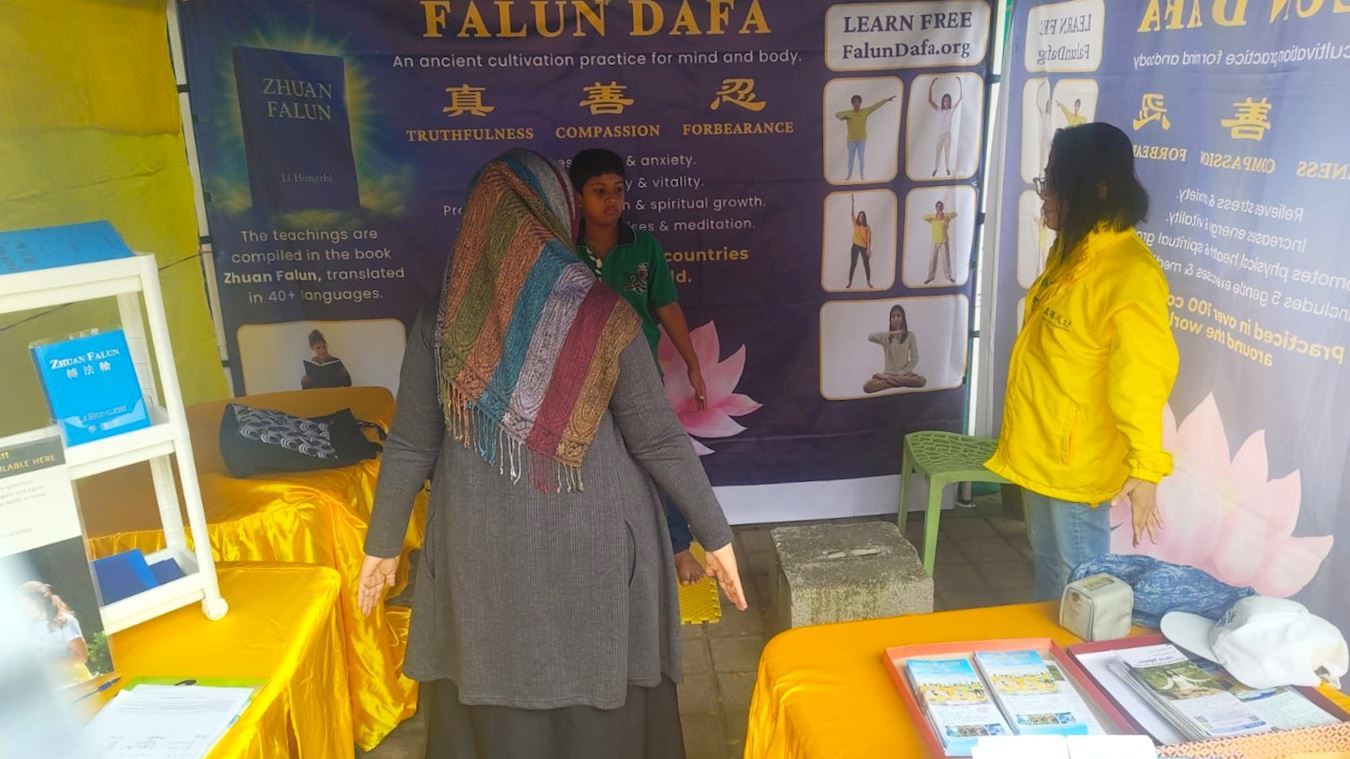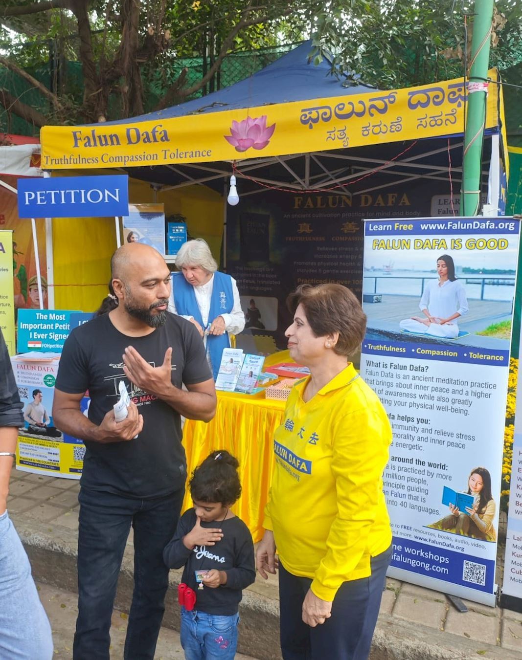 桑托什(Santhosh)在法轮功学员的展位前停下了脚步,他肯定了学员们的做法,认为很有意义。他说:“你们所做的是伟大的善举。”他对学员们所秉持的高尚的道德标准表示敬佩。