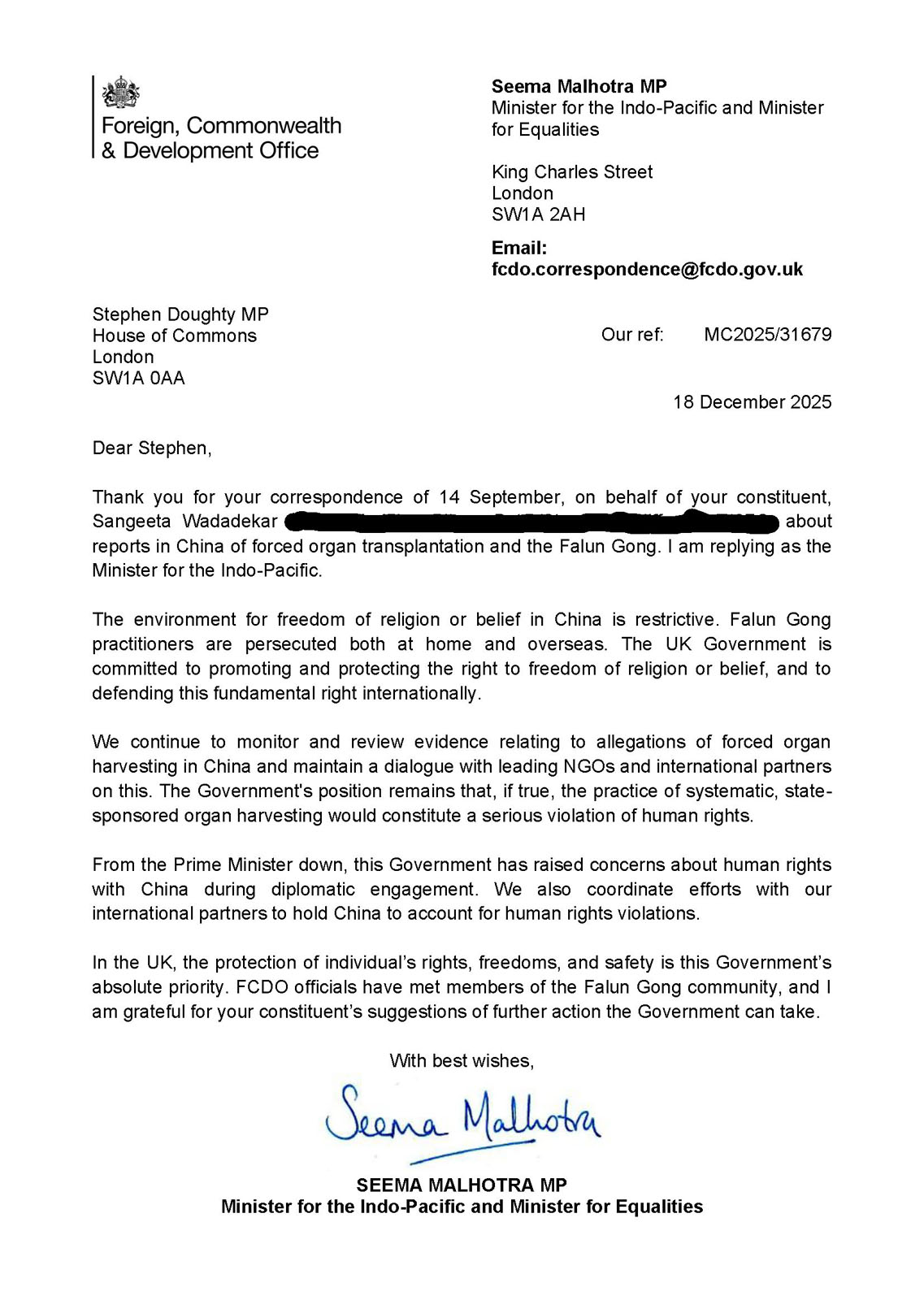 此前,史蒂芬·道蒂议员收到其选区居民瓦达德卡尔(Sangeeta Wadadekar)女士就法轮功遭受迫害及活摘器官问题的来信,他因而向外交部提出质询。