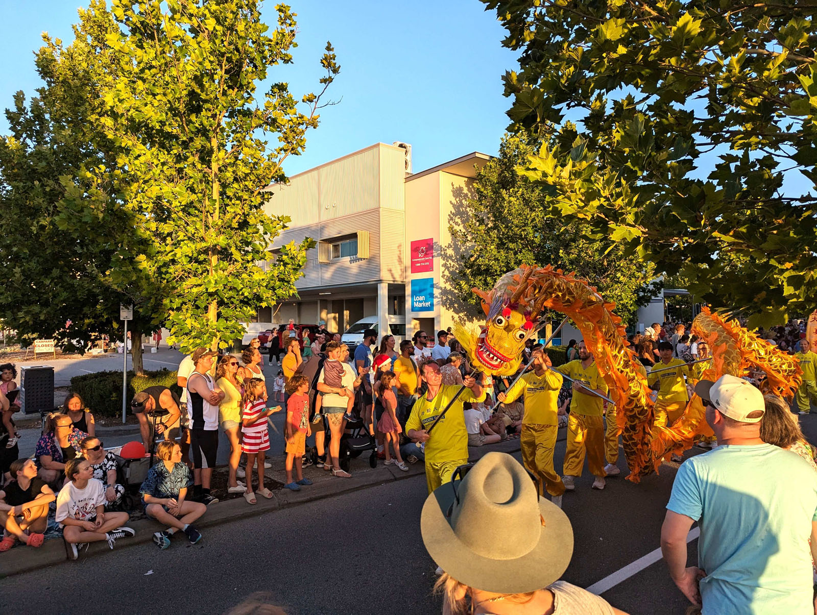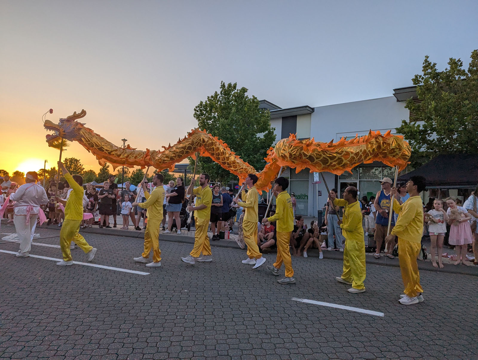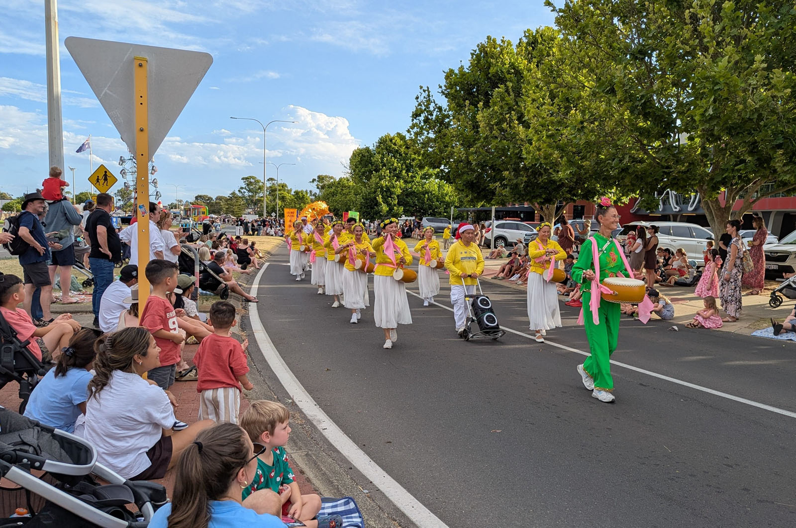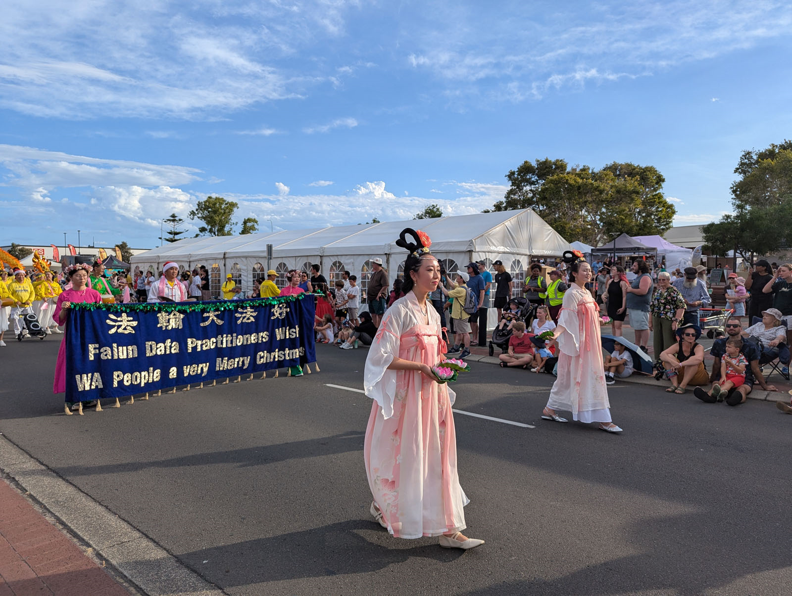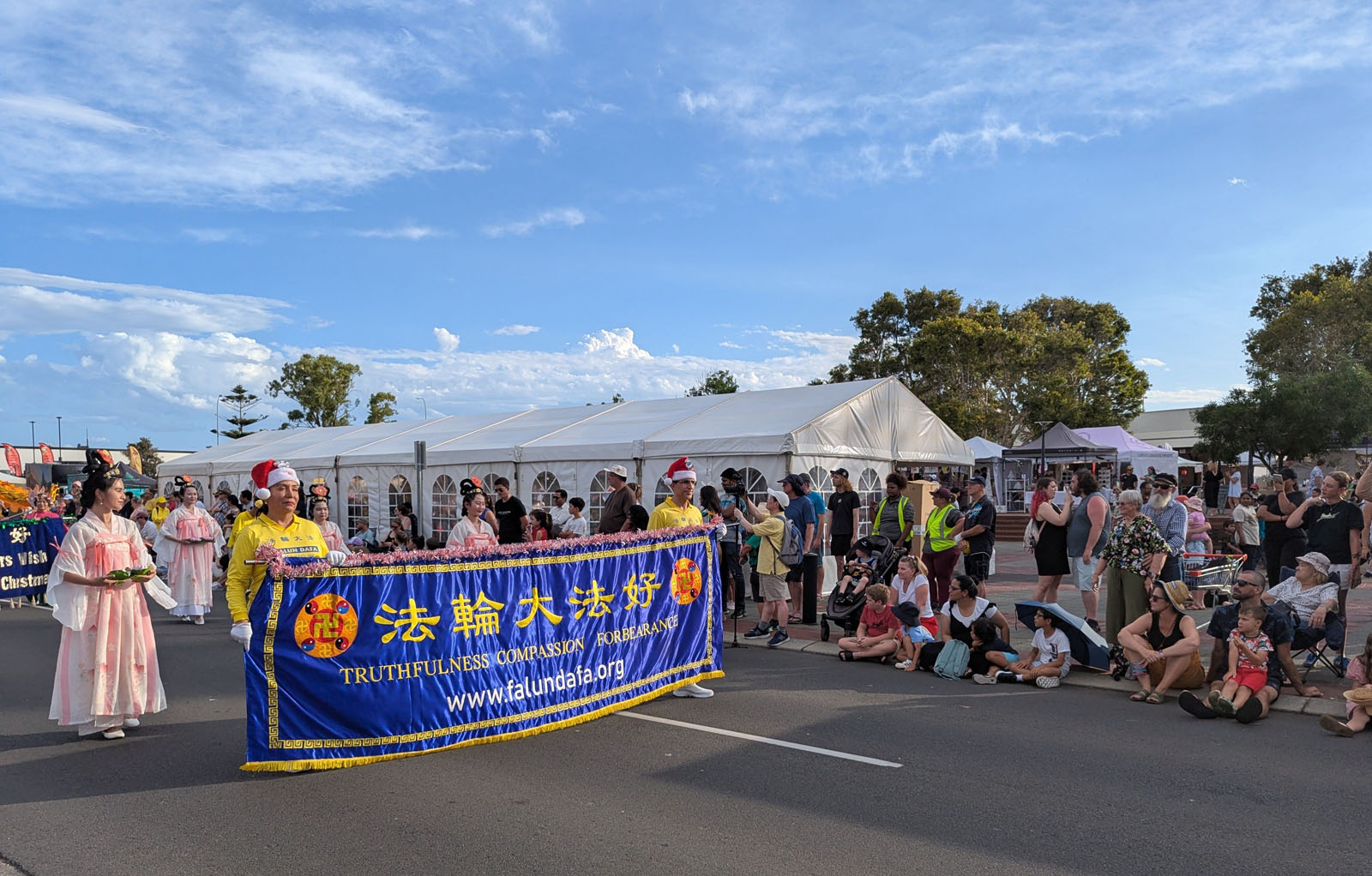 十二月十四日傍晚,在班伯利(Bunbury)市举行的圣诞游行中,西澳法轮功学员的游行队伍格外引人瞩目。由法轮功学员的仙女队、腰鼓队、彩旗队和舞龙队组成的游行方阵,色彩明亮绚丽,鼓声振奋人心,气氛祥和美好,威武矫健的金龙与观众们的热情互动,更是赢来一片惊喜与掌声。