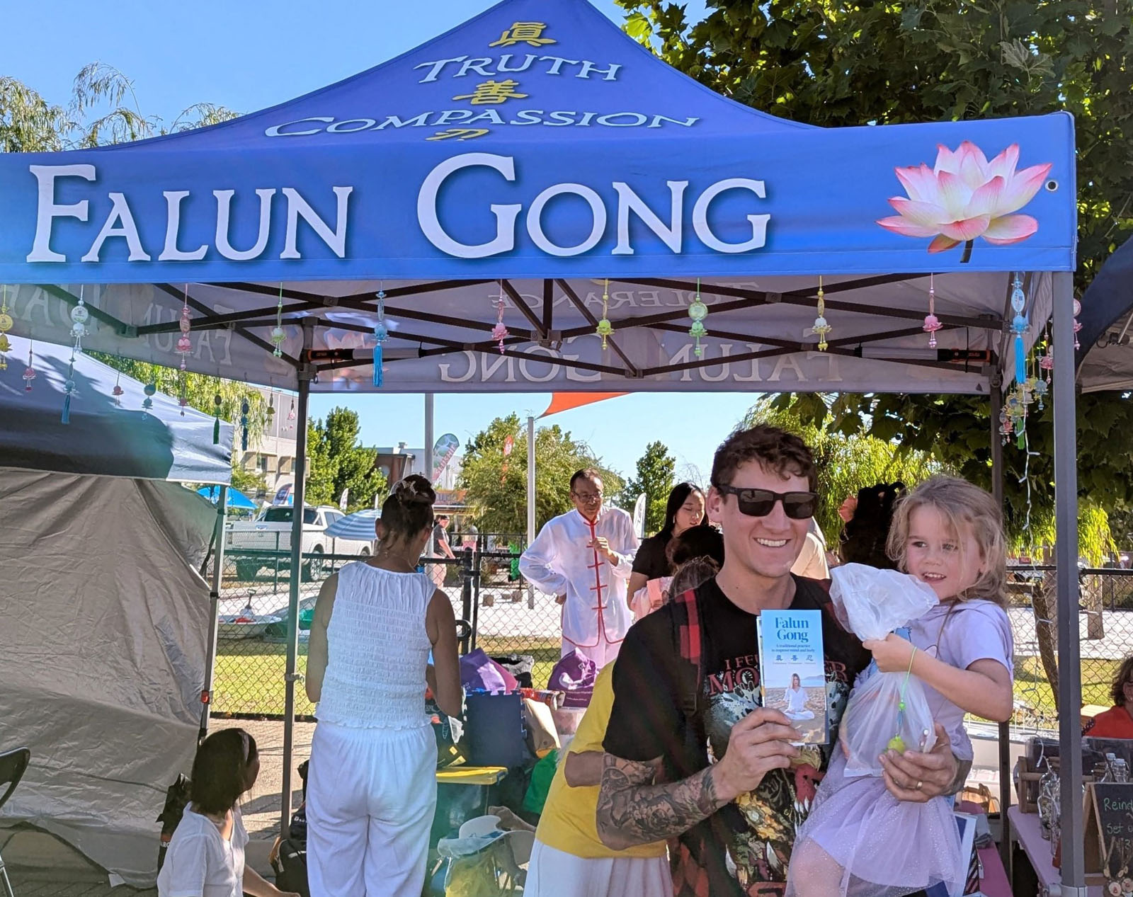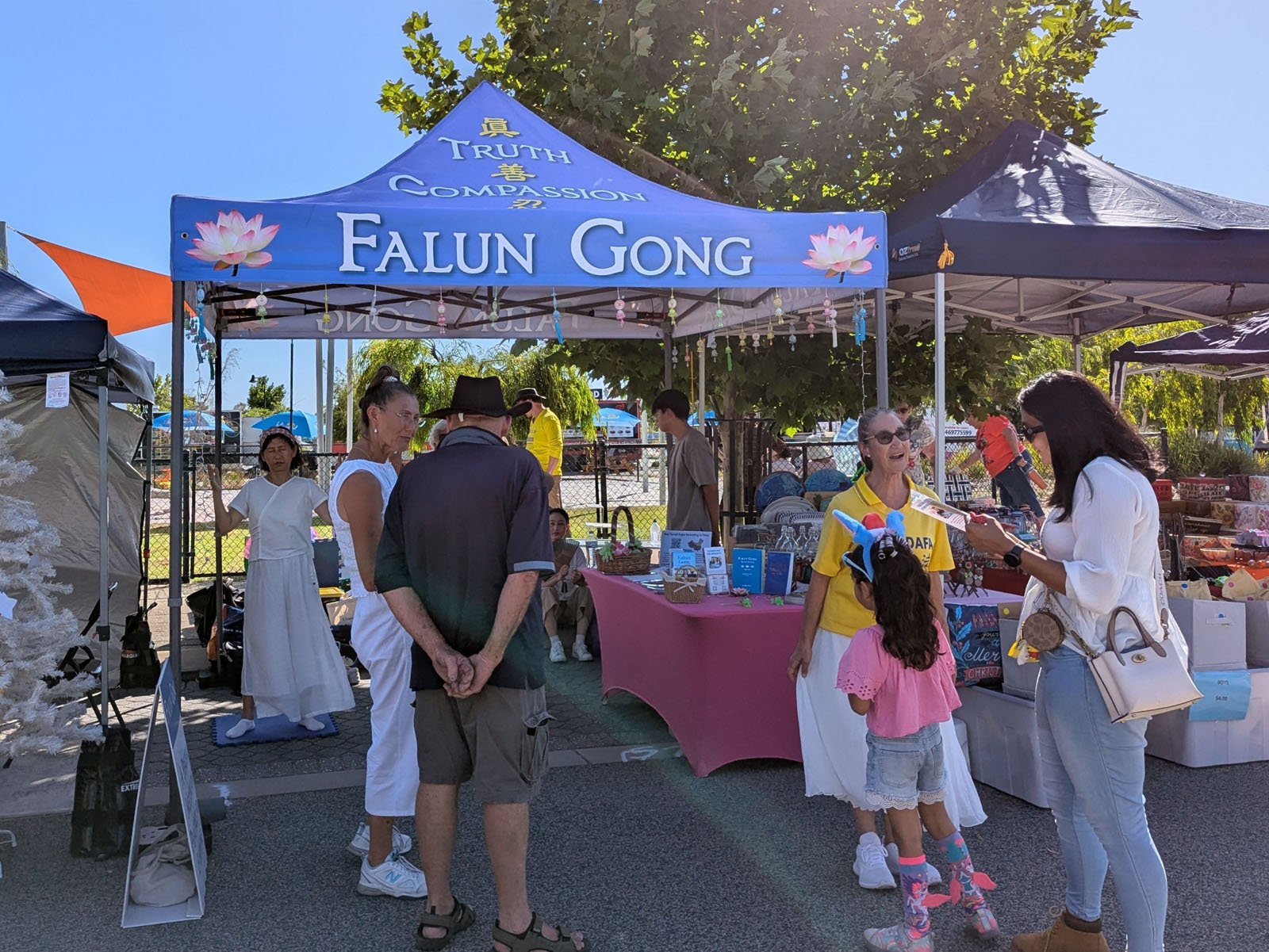 许多观众被法轮大法学员的展位所吸引。展位以明亮的色彩布置,与周围环境交相呼应。一些法轮功学员从外地赶来参加此次活动,与来访者分享法轮大法这一平和的修炼功法。