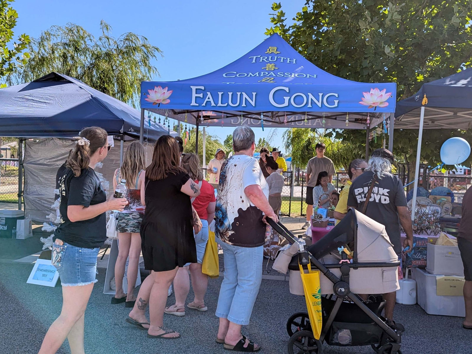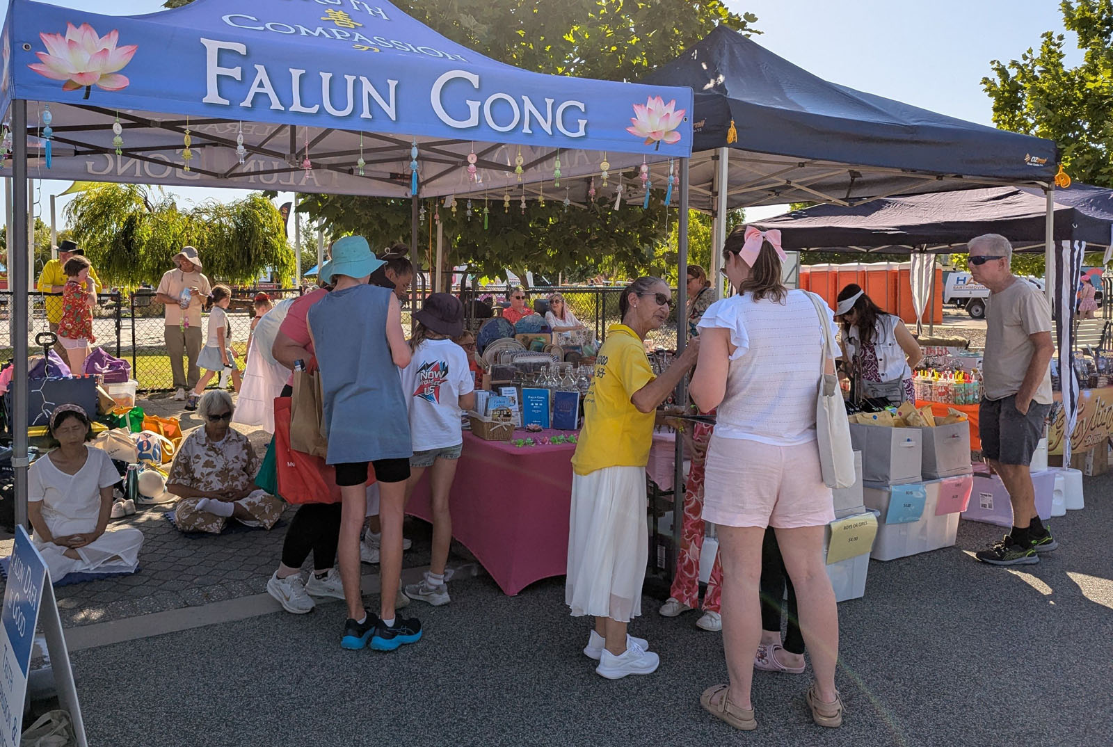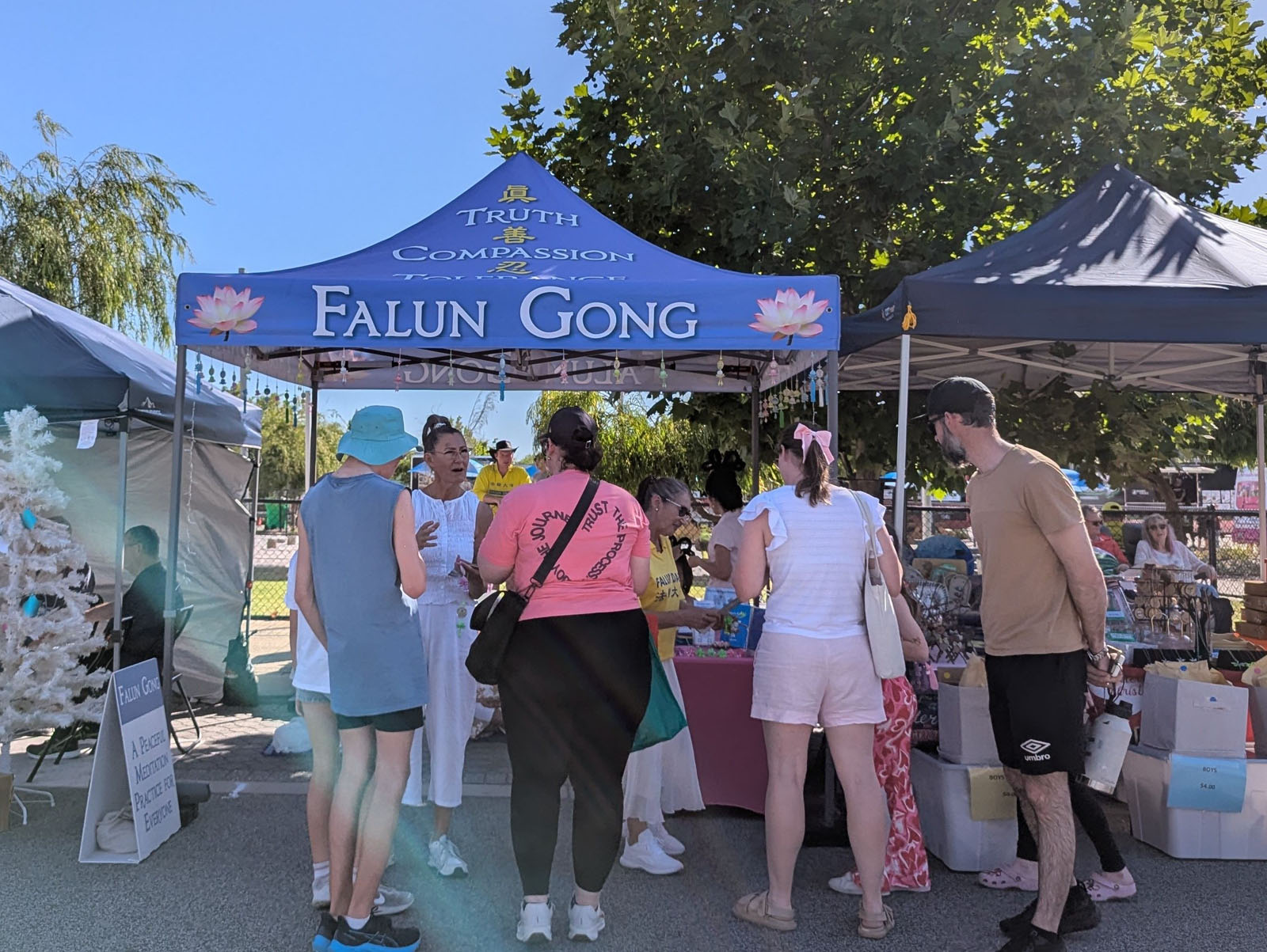 西澳法轮功学员在展位上向人们介绍法轮大法,并演示了五套功法。