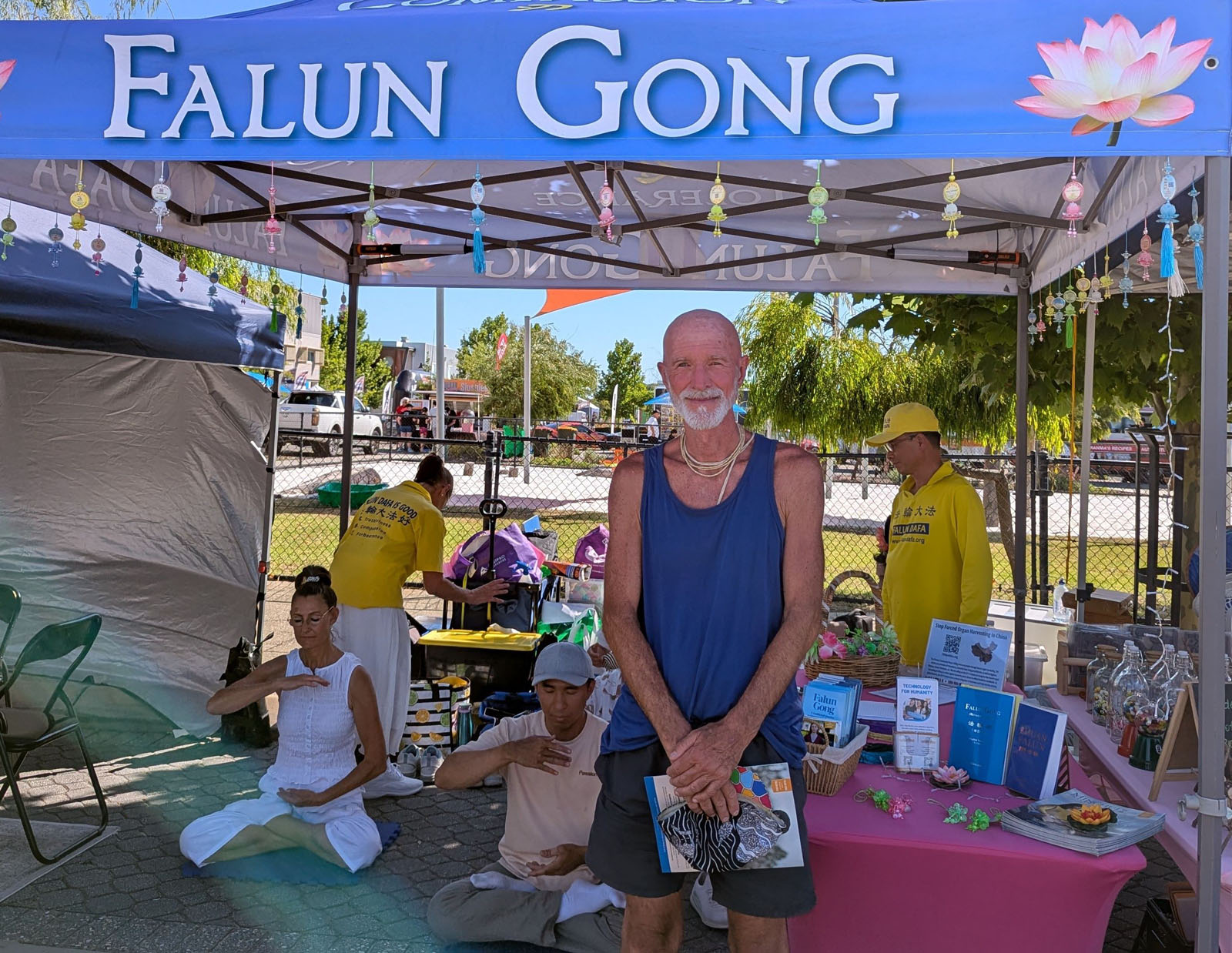 约翰·纳吉(John Nagy)来到展位,他告诉法轮功学员,他逛遍了当天的展位,“法轮大法展位是最亮眼的”。