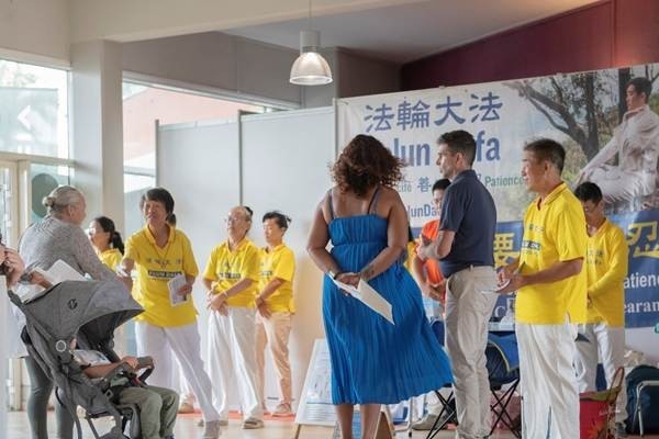 现场,法轮大法舒缓、祥和的音乐吸引了不少参观者驻足。学员们主动向来自不同背景的人士介绍法轮大法;现场演示功法;并讲解以真、善、忍为原理的修炼方式已使全球无数人受益。