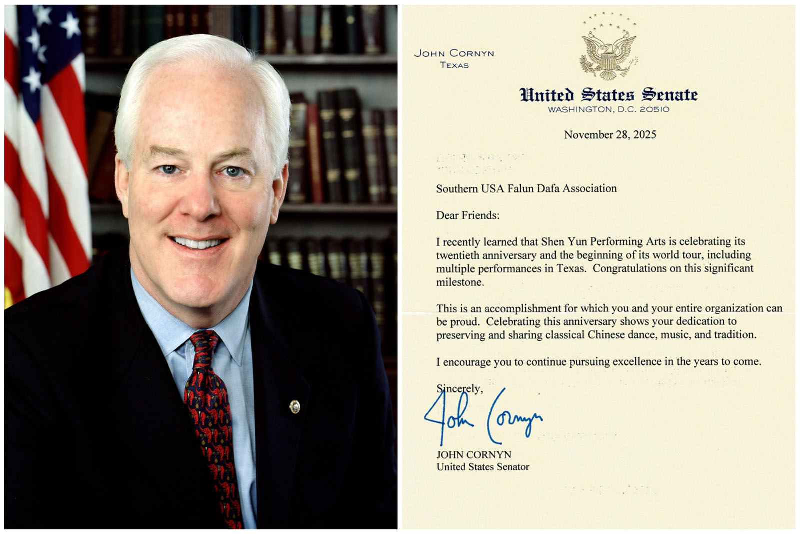 美国德克萨斯州联邦参议员约翰‧科宁(John Cornyn)致信祝贺神韵艺术团成立二十周年。他说:“对于这一重要的里程碑,我对此表示祝贺。”科宁还说:“这是你们及整个团队都值得骄傲的成就。庆祝二十周年,彰显了你们对传承与分享中国古典舞、音乐及传统的奉献精神。”他鼓励神韵艺术团在未来的岁月里,继续追求卓越。