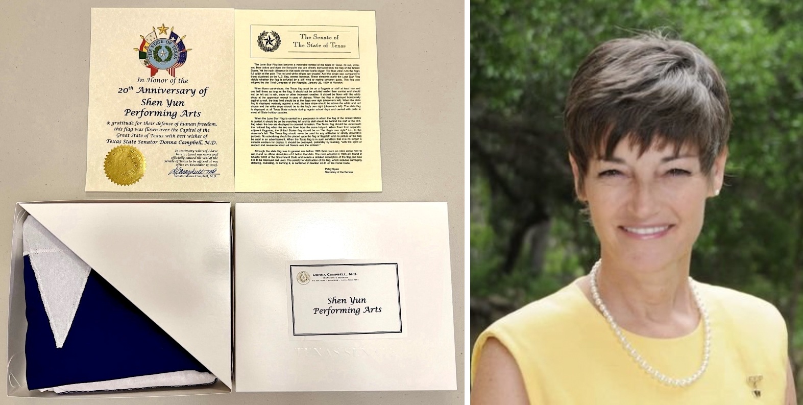 为表彰神韵艺术团成立20周年,并感谢其长期捍卫人类自由的努力,二零二五年十二月十七日,德克萨斯州州参议员唐娜‧坎贝尔(Donna Campbell, M.D.)向神韵致赠一面曾在德州州议会大厦升挂过的德州州旗。
