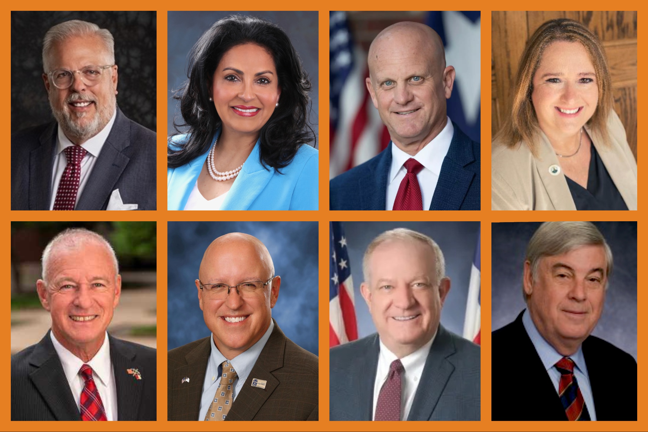 图9:(自上至下)左起:阿灵顿市长吉姆·罗斯(Jim Ross)、科珀斯克里斯蒂市长保莱特·M·瓜哈尔多(Paulette M. Guajardo )、梨城市长凯文·科尔(Kevin Cole)、沃克西哈奇市长比莉·华莱士(Billie Wallace)、法默斯布兰奇市长特里· 林恩(Terry Lynne)、萨克斯市长杰夫·比柯斯塔夫(Jeff Bickerstaff)、拿骚湾市长菲尔·约翰逊(Phil Johnson)、泰勒莱克村市长乔恩·基尼(Jon Keeney)。(大纪元)