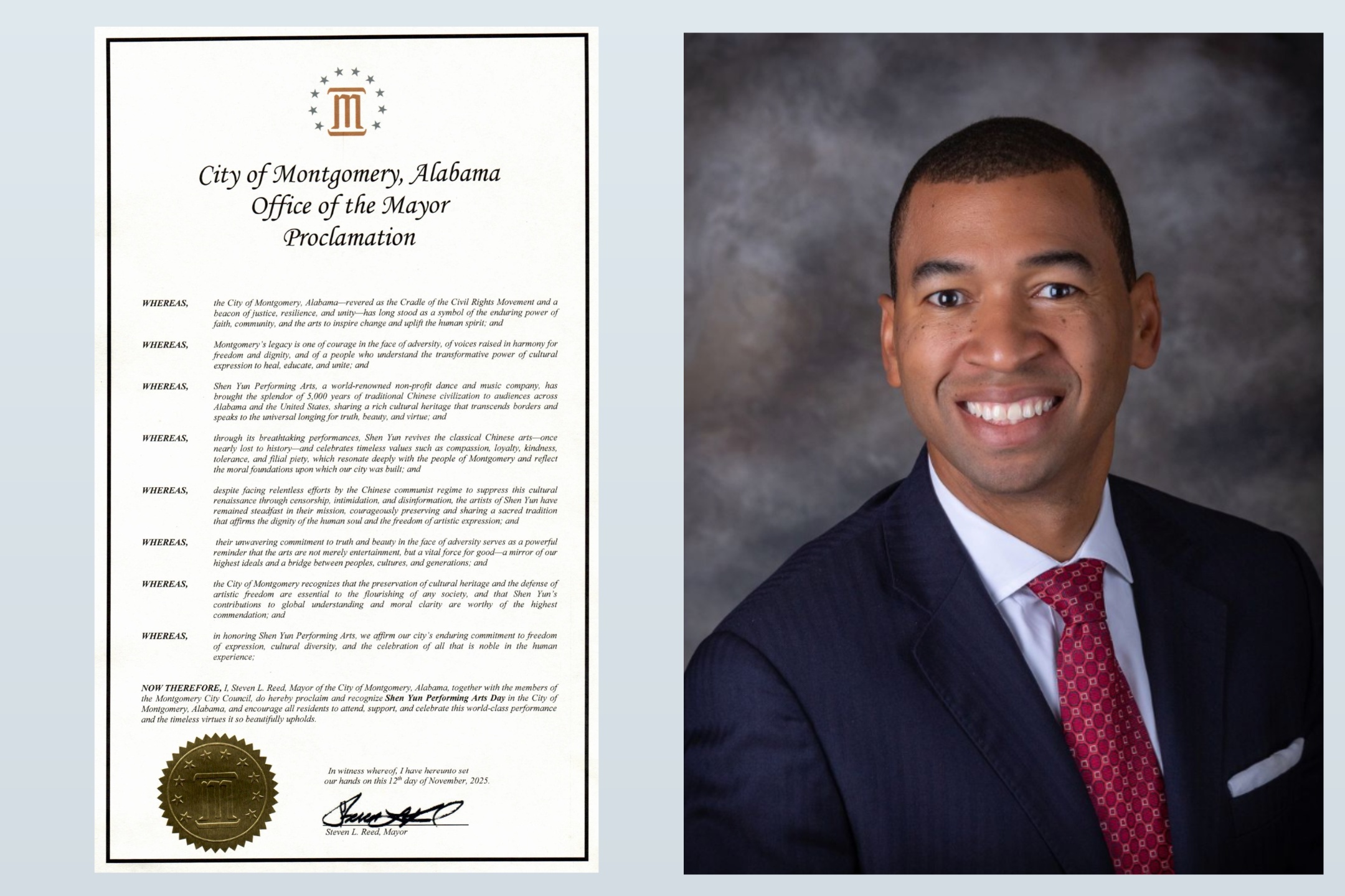 美国阿拉巴马州首府蒙哥马利市(Montgomery)给神韵艺术团发出褒奖信,表彰其在文化传承与艺术交流方面的杰出贡献,宣布“神韵艺术团日”,并鼓励全体市民共襄盛举,庆贺这场世界级演出及其所弘扬的美德。