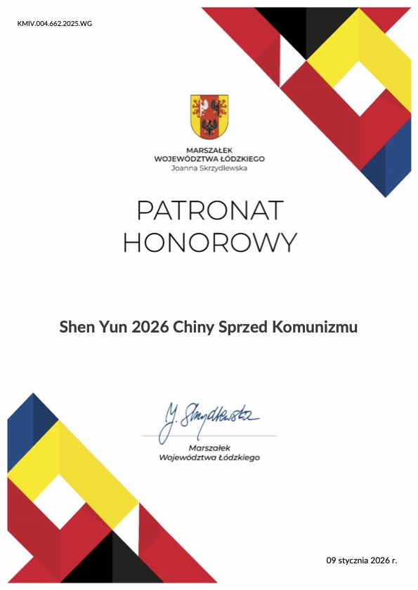 图11:波兰罗兹省长授予神韵演出“荣誉赞助”。证书中写道:荣誉赞助,神韵2026:共产主义之前的中国。(罗兹省长提供)