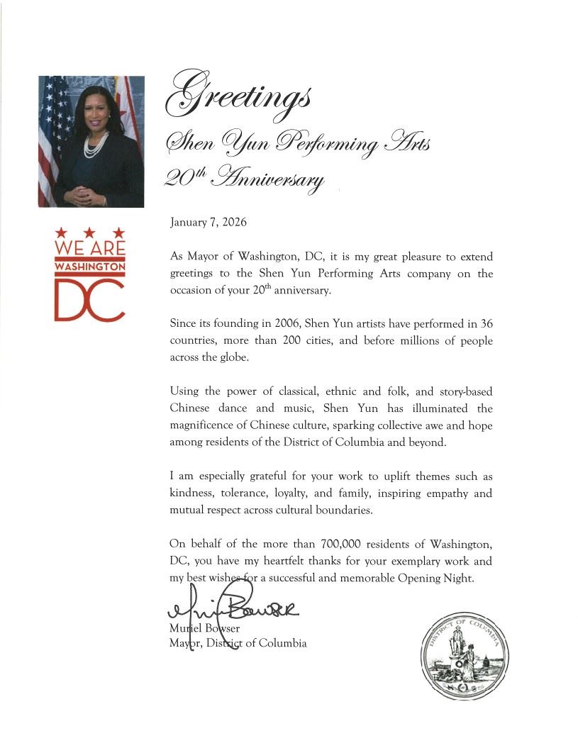 【明慧网二零二五年十二月二十五日】(明慧记者李静菲美国华盛顿DC报道)美国华盛顿哥伦比亚特区市长穆丽尔·鲍泽(Muriel Bowser)恭祝神韵艺术团成立二十周年。她感谢神韵艺术团的杰出成就,生动展现了中华文化的壮丽辉煌,弘扬普世价值,跨越文化界限,促进相互尊重。她感谢神韵为华盛顿特区居民以及世界各地的千千万万观众带来希望,令观众敬佩,并祝愿二零二六年一月七日晚在华盛顿的首场神韵演出圆满成功、令人难忘。