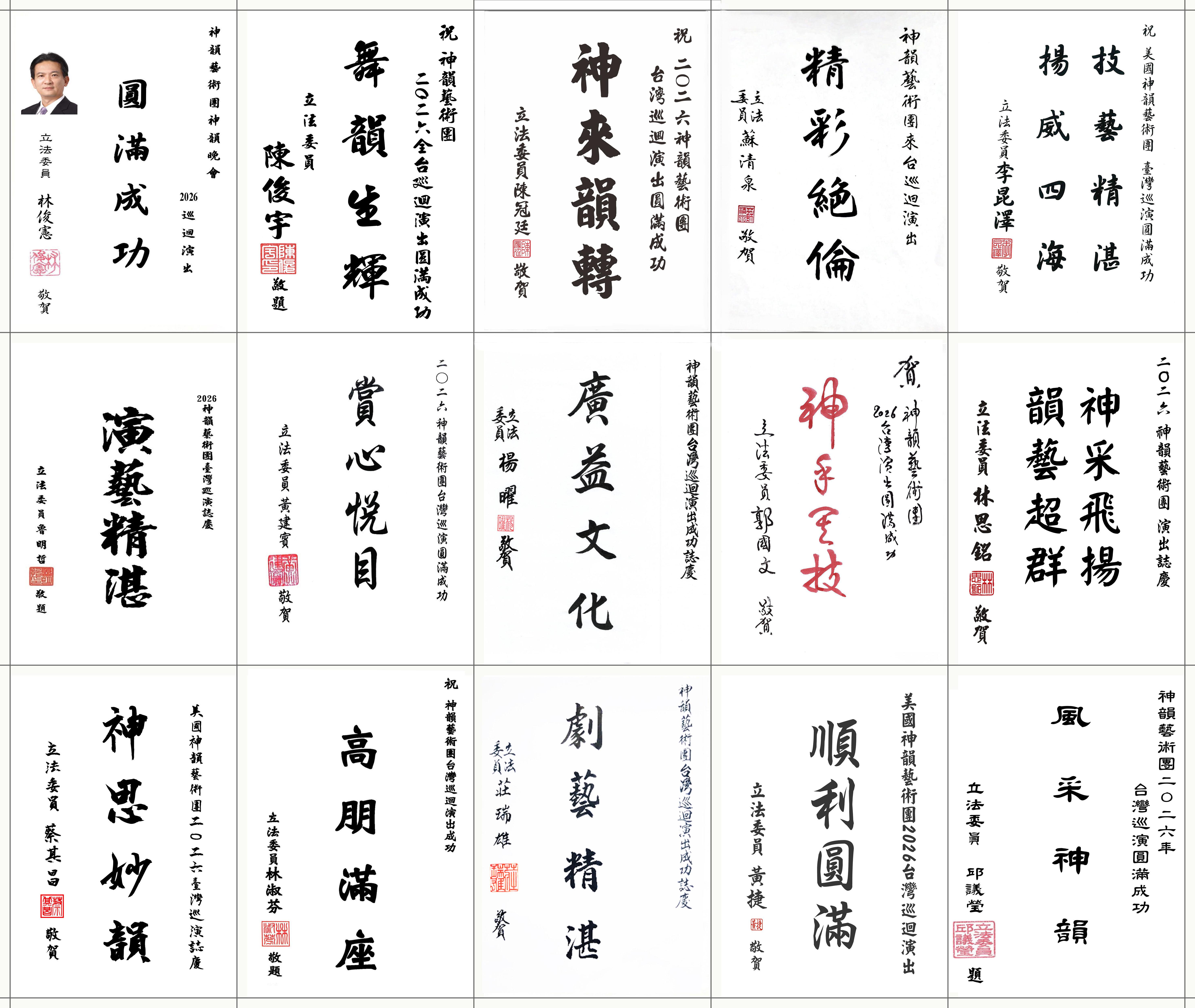 神韵“世界第一秀”的顶级口碑在台湾主流精英圈广为流传,每年均吸引大批政要名人入场观赏,诸多国会议员也纷纷致赠贺词,赞赏和迎接神韵的到来,今年计有七十位。包括立法委员王定宇赞神韵“舞艺倾城”;立法委员沈伯洋祝神韵“圆满成功”;立法委员吴思瑶赞神韵“声艺卓绝”;立法委员何欣纯赞神韵“艺臻化境”;立法委员邱志伟题赠“姿雅荠妙”;立法委员许智杰以“神传舞艺展风华,韵蕴弦音利人天”欢迎神韵;立法委员赖瑞隆赞神韵“艺海生辉”;立法委员钟佳滨赞叹神韵“神韵妙现”;立法委员苏巧慧称赞神韵“传道宏艺”。(节选)