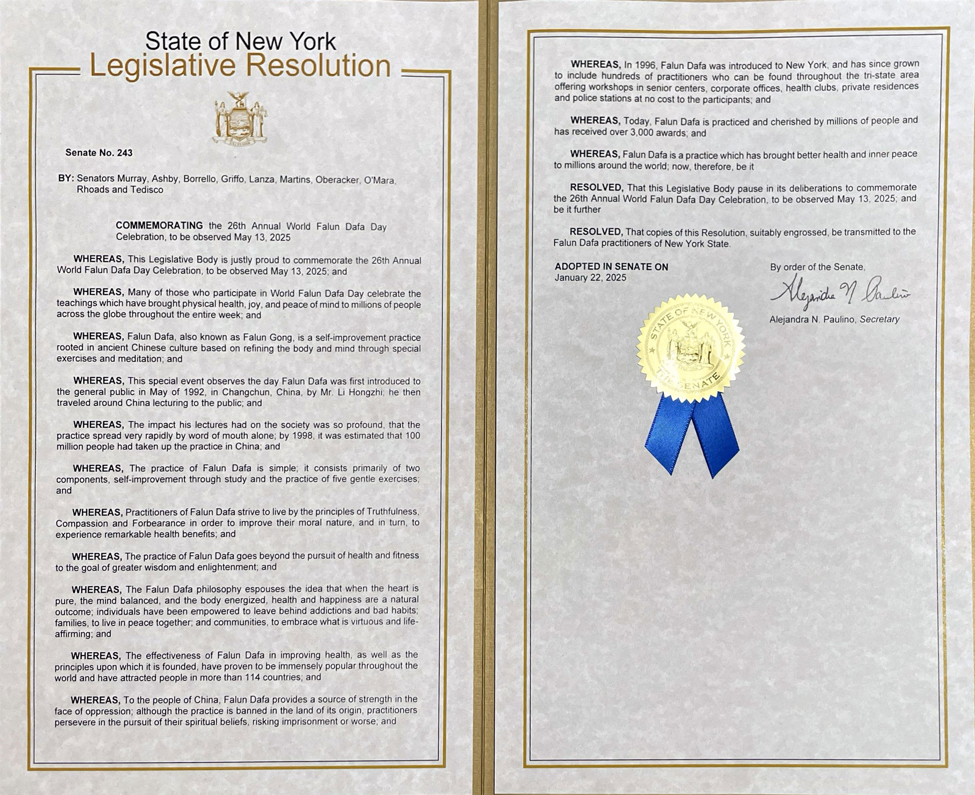 参议会特别指出,在法轮大法日之际,感念其为社区与世界所带来的正面影响,并决议 正式表彰二零二五年五月十三日的庆祝活动,并将决议副本传送予纽约州的法轮大法修炼者, 以资鼓励。