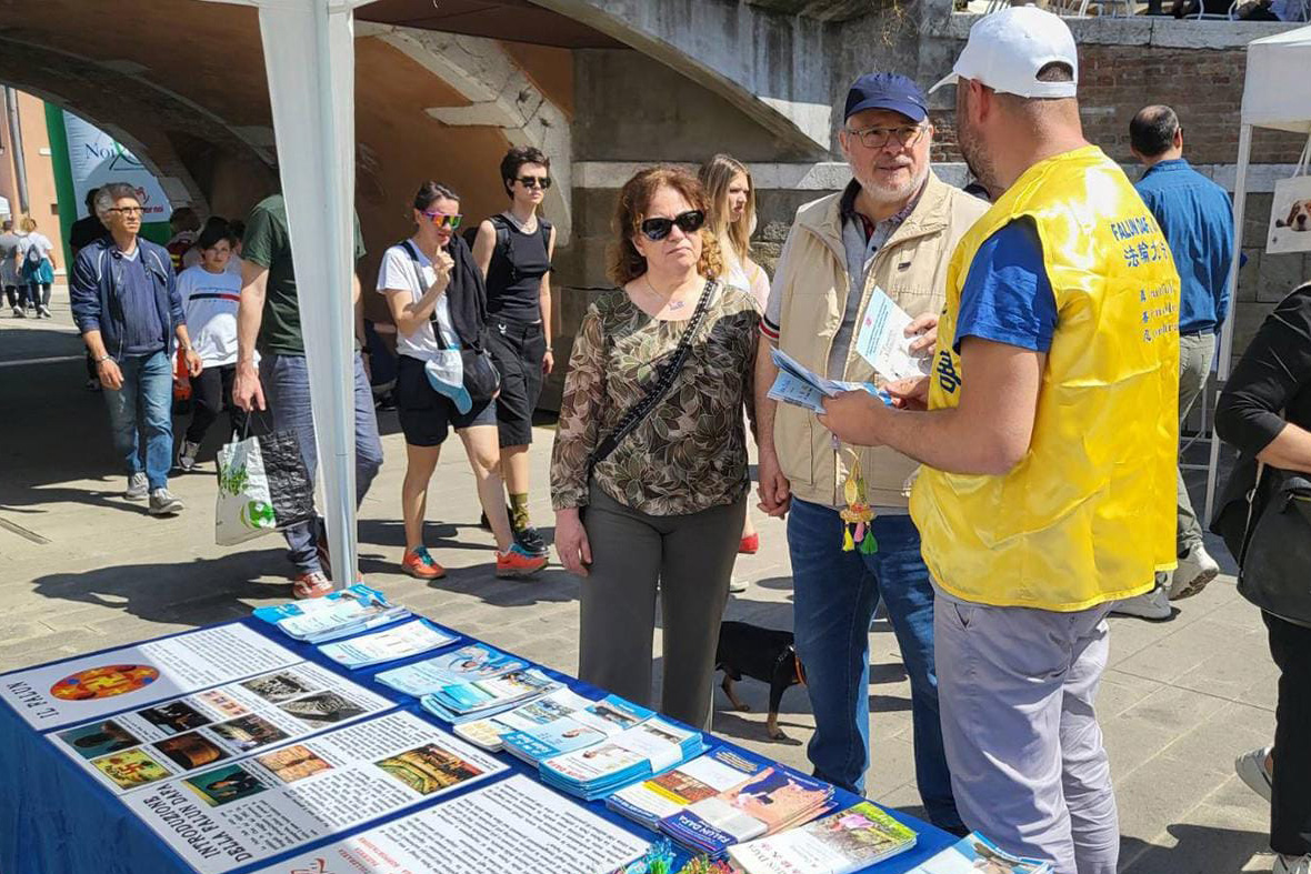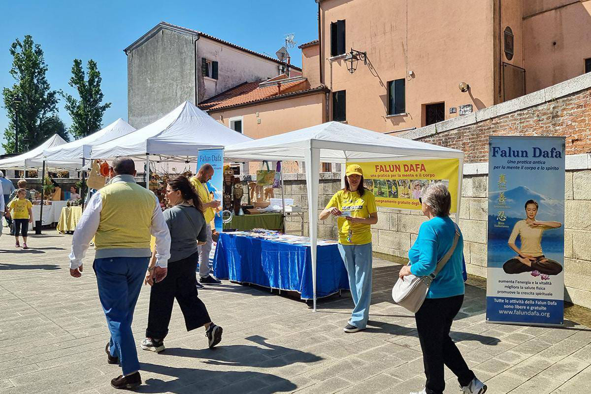 五月一日,威尼斯地区的大法学员在都娄(Dolo)小镇参加了一场社区活动(Dolo in fiore),向市民展示法轮大法的美好,庆祝5.13世界法轮大法日。