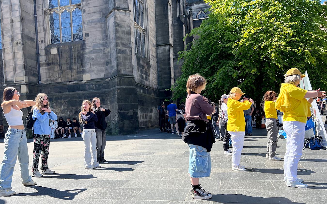 ![]() 图1:二零二五年五月十七日,法轮功学员在苏格兰首府爱丁堡著名的王家一英里大街举办庆祝活动,一群来自捷克的学生跟随法轮功学员学炼动作。 |