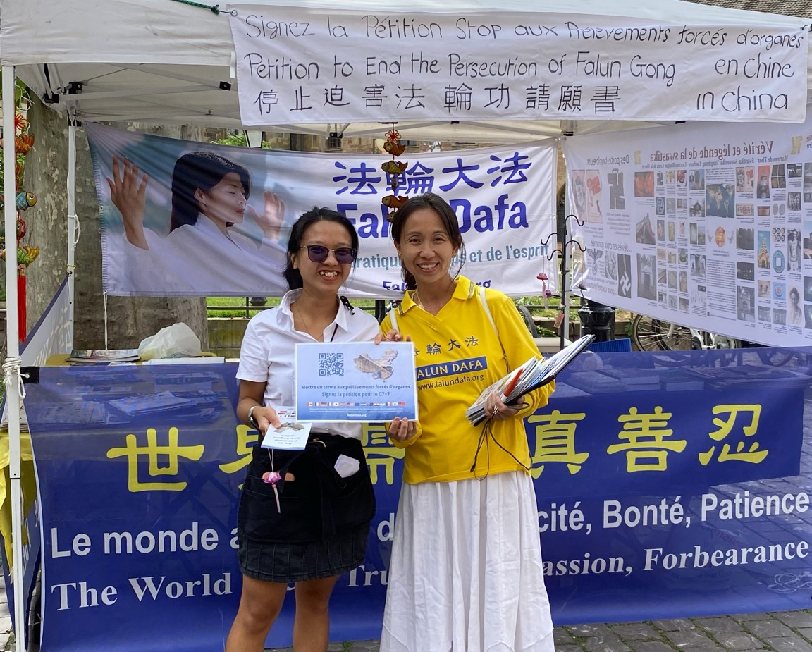一位越南裔的年轻女士在了解真相后,签署了旨在终止强迫器官摘取的“G7”请愿书。她认为这些有关迫害的资讯应该让更多人知道,尤其是透过社交媒体。因此,她与一位法轮功学员合影,以进一步引起社交媒体上网民的关注。她表示欣赏法轮功的基本价值观,并希望能学习这些功法。