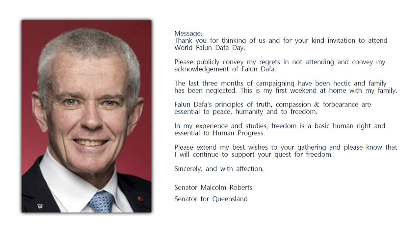 一国党代理党鞭参议员马尔科姆·罗伯茨(Senator Malcolm Roberts)致信祝贺世界法轮大法日。