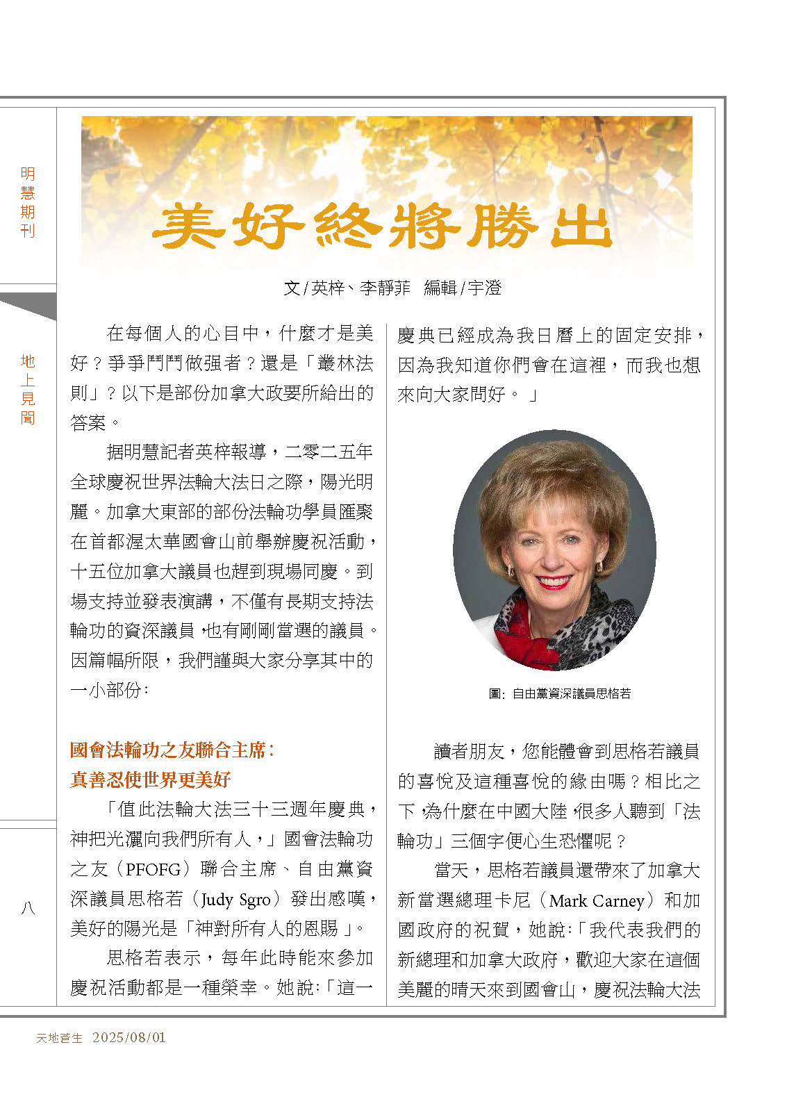 ![]() 图2:2025年5月28日,国会议员Judy Sgro在法轮大法洪传33周年庆典上演讲。 |