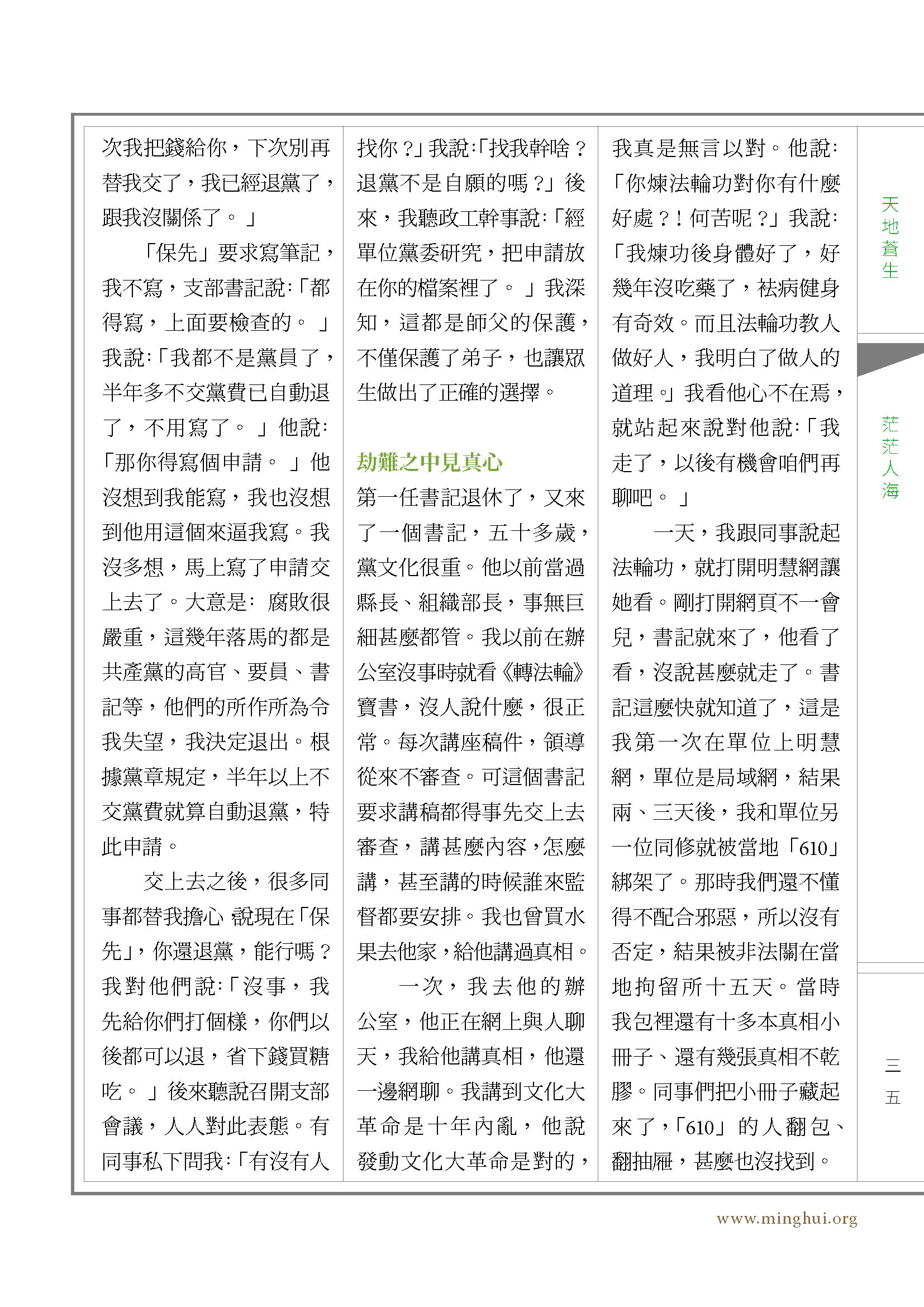 刚开始讲真相时,真相资料很少,我就从周刊上抄写一些适合世人看的资料,拿到单位一个班组一个班组的给同事们看,同事们大都明白了大法是被迫害的。后来由于单位迫于压力,一到邪党的所谓敏感日,就非法把公司的大法弟子拘起来,我因此离岗,单位也解散了,同事们被分配到别的单位,后来几乎就没见过单位的同修。