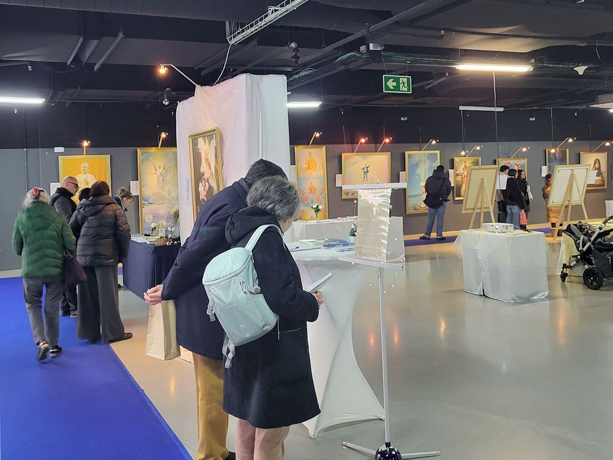 '图1~7:1-7 真善忍国际美术展在比利时第四大城市法语区列日市,二零二五年十二月十二日至二零二六年一月十一日一个月的展出。参观人员络绎不绝。'