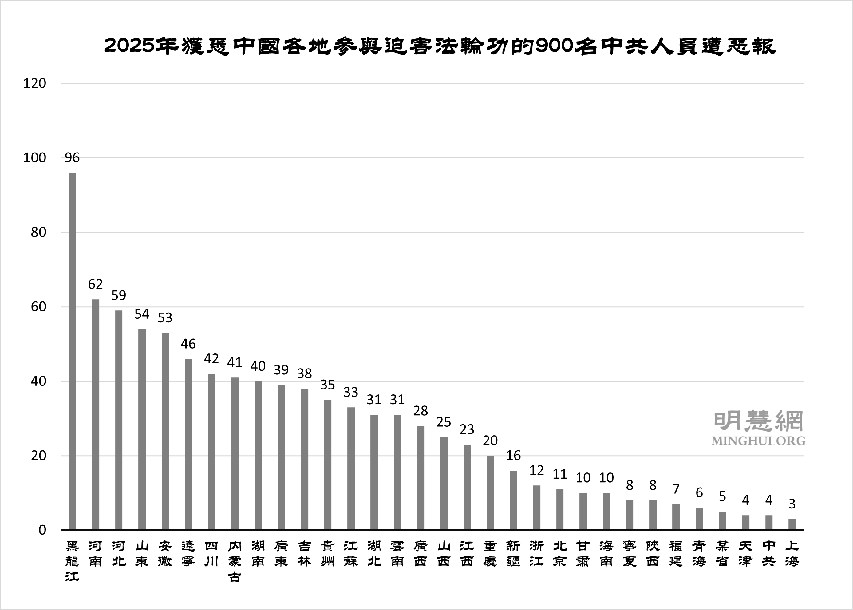 ![]() 图1:2025年获悉中国各地参与迫害法轮功的900名中共人员遭恶报 |