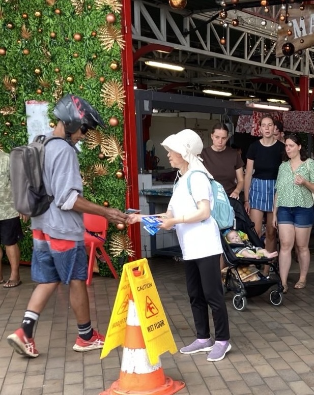 ![]() 图1:二零二五年圣诞假期和二零二六年新年期间,新西兰法轮功学员前往大溪地岛弘法。图为一名学员在市场门前发放法轮功真相资料。 |