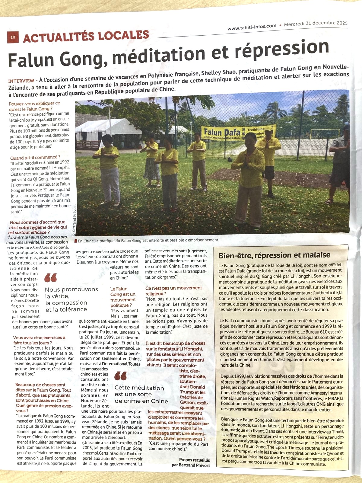 当地最大的媒体《大溪地信息报》对学员们做了专访,在当地新闻版以《法轮功、打坐和被镇压》为题,以整版的篇幅全面的报道了有关法轮功的真相。