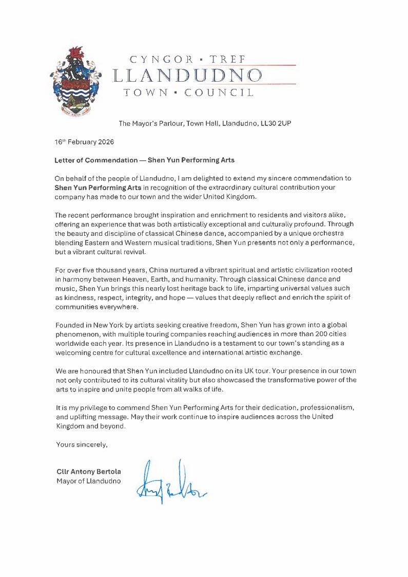 在二月十六日颁发的表彰信中,贝托拉市长表示,兰迪德诺能够成为神韵英国巡演城市之一,深感荣幸。神韵的到来不仅丰富了本地文化生活,也展现了艺术启迪人心、凝聚社会的力量。