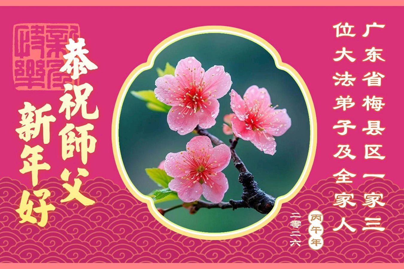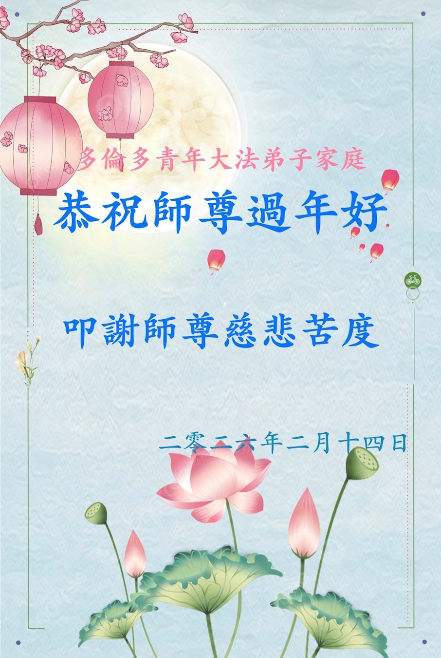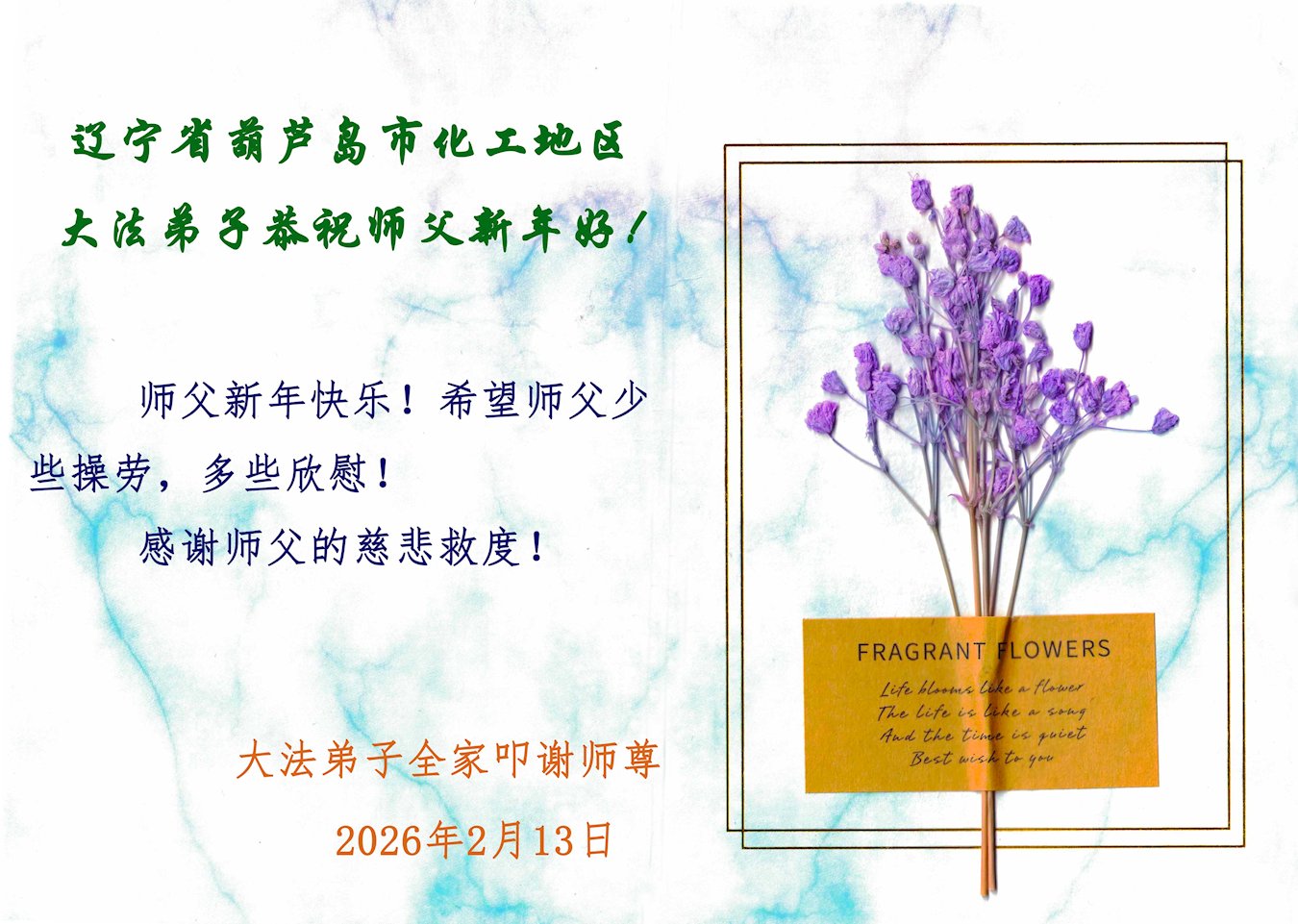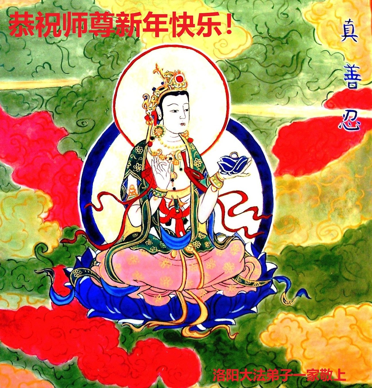 尊敬的李大师您好,您辛苦啦!在新年到来之际,我们一家给李大师拜个早年,祝李大师新年快乐!谢谢您的慈悲救度!