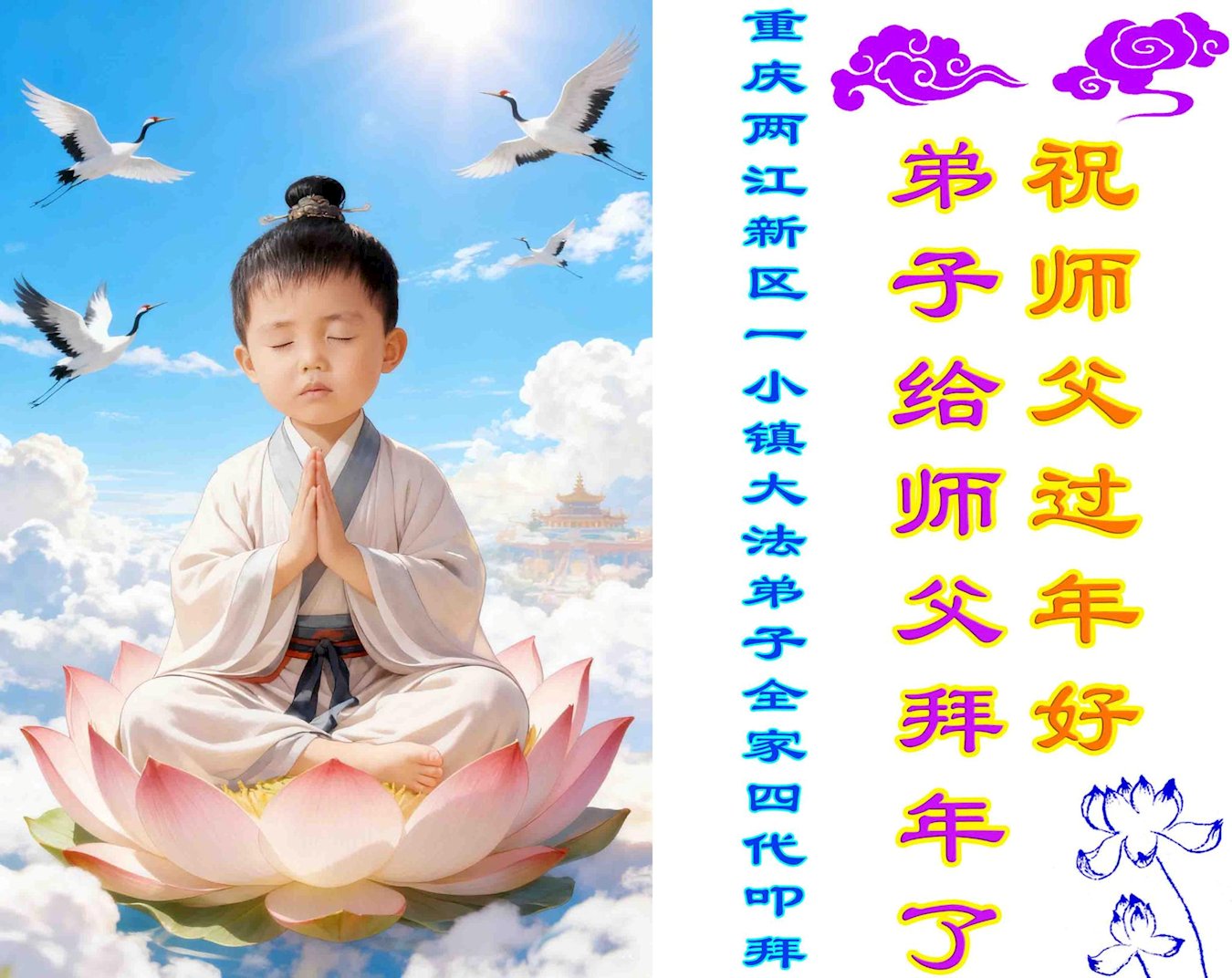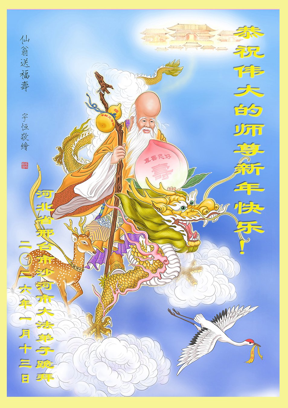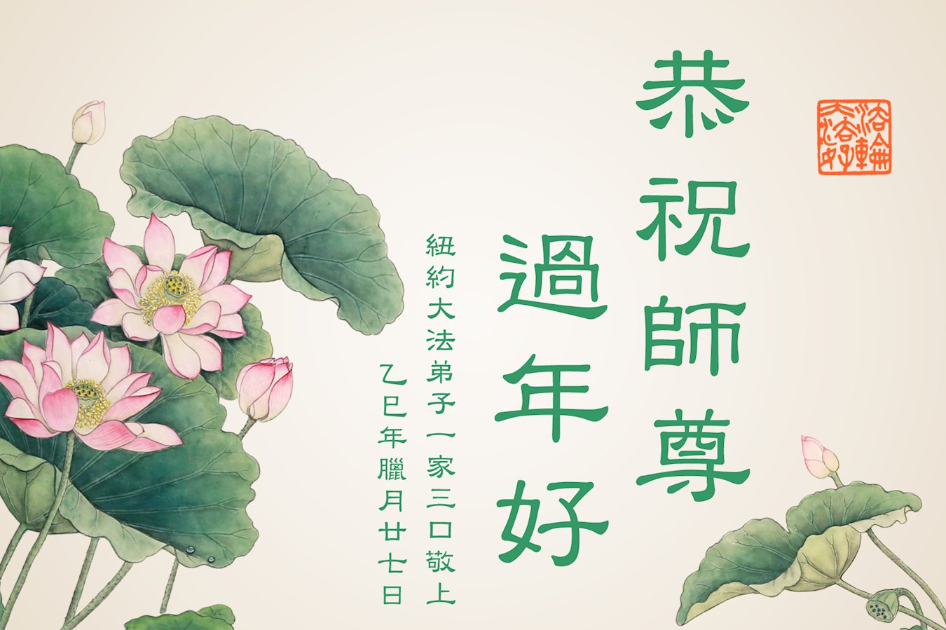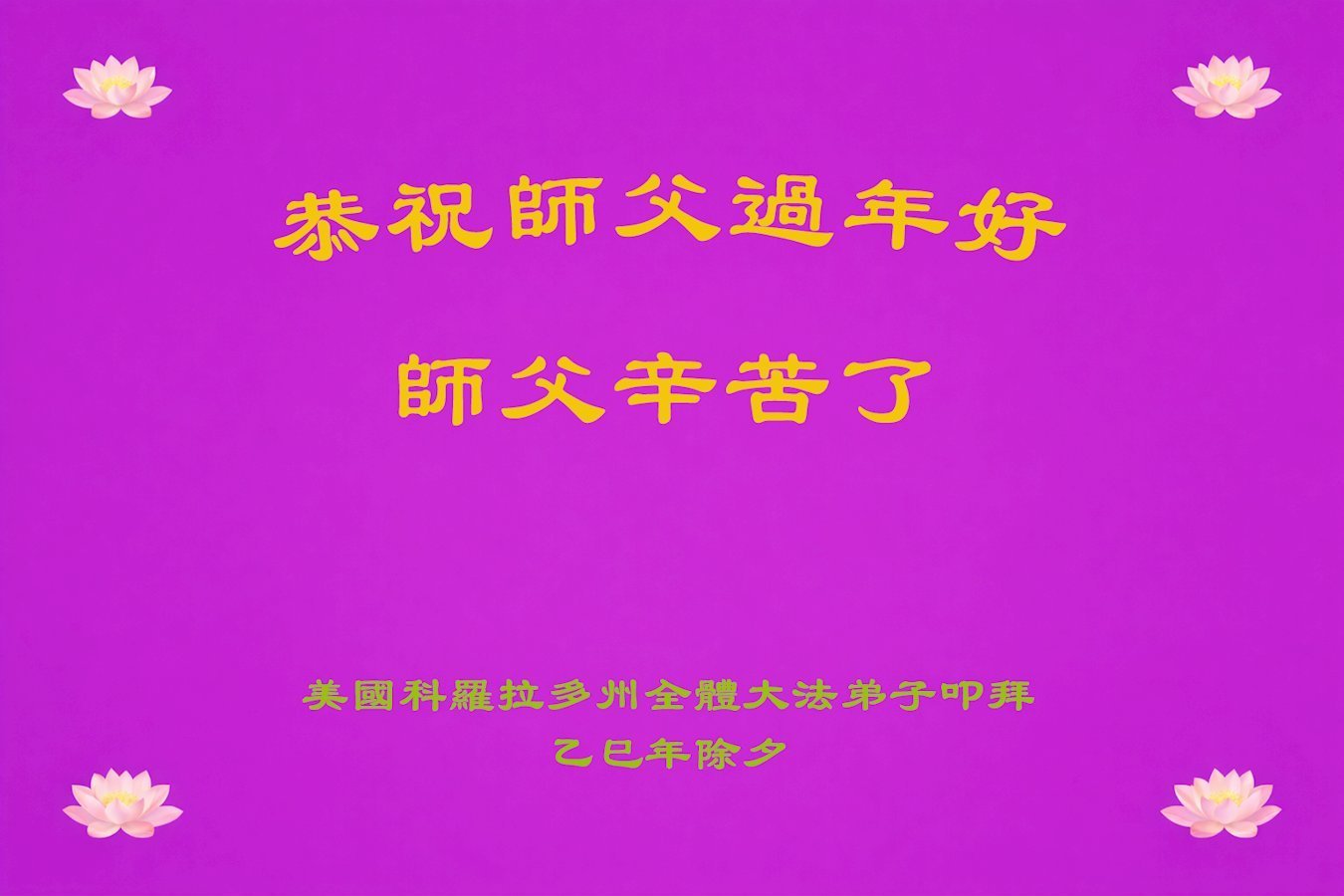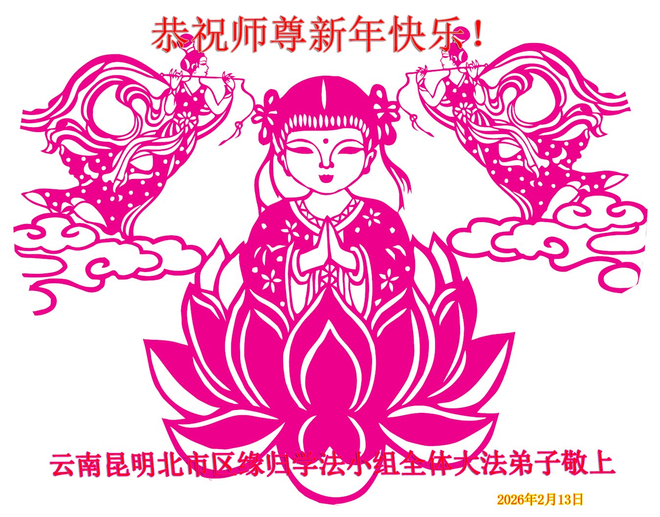 尊敬的李大师您好,您辛苦啦!在新年到来之际,我们一家给李大师拜个早年,祝李大师新年快乐!谢谢您的慈悲救度!