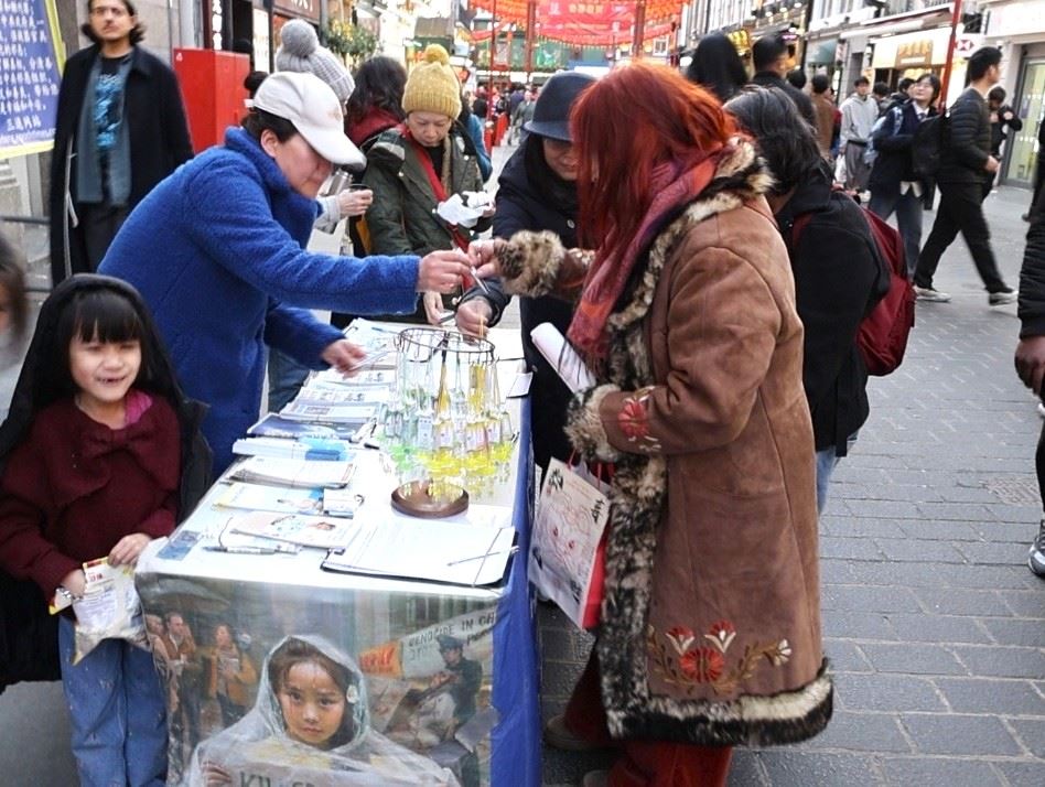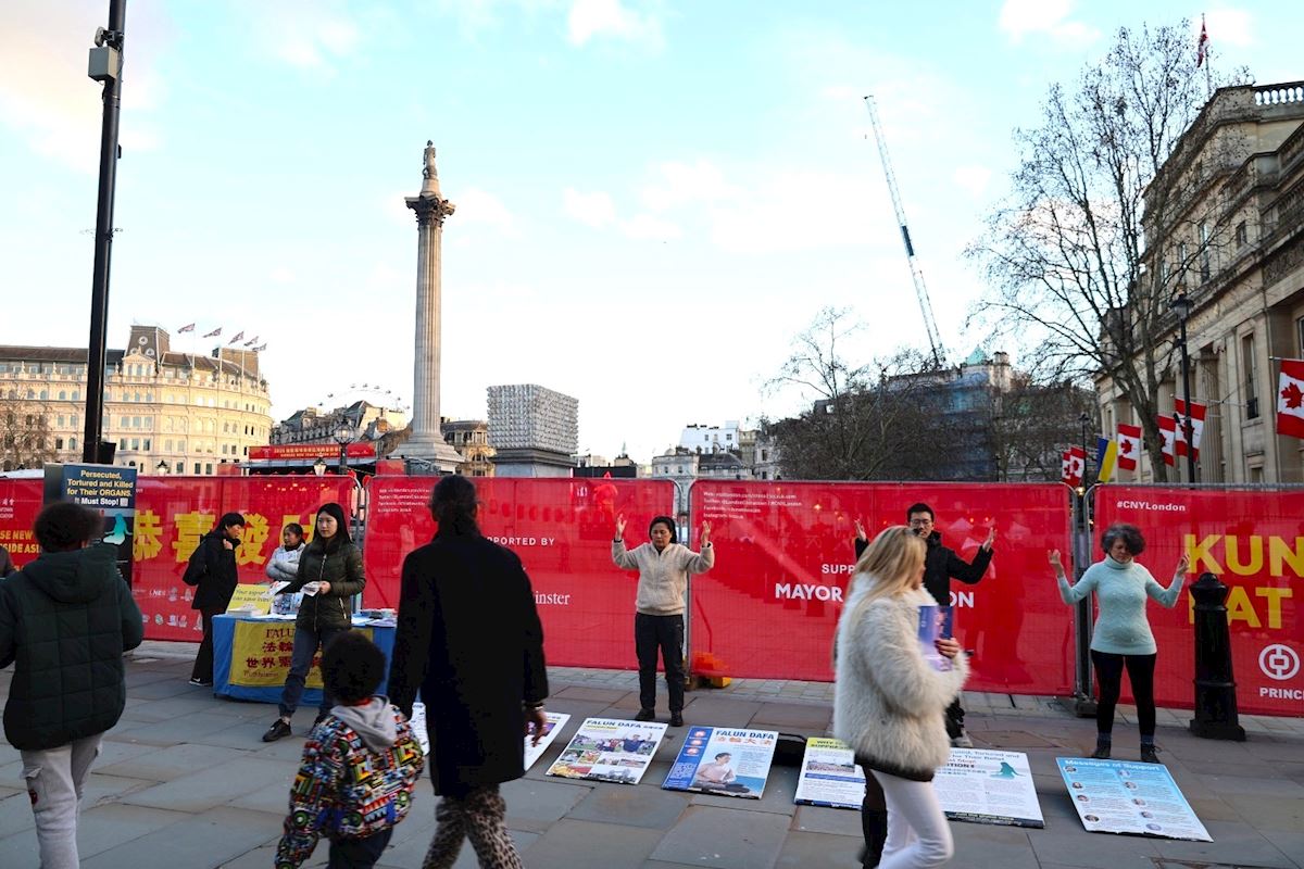 唐人街上张灯结彩,舞狮舞龙的表演吸引大量游客拍照。法轮功展位就设在广场北面平台上、面对英国国家画廊,距离唐人街(Chinatown )仅需三分钟步行,这里游人如织,是各国游客打卡的地标景点之一,来来往往的人们都能看到法轮功的展位。华人及各国游客停下脚步了解法轮功在全球弘传和在中国被中共迫害的真相,不少游客在了解真相后表示支持反活摘征签,有人鼓励学员继续坚持,更多人签名呼吁停止迫害。