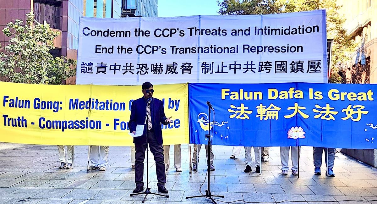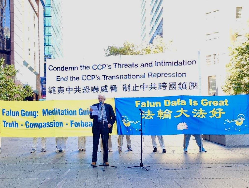 “我们今天聚集于此,是为了提高公众对法轮功遭遇的认识,因为这正是中国人民,以及澳洲或其它国家受中共控制的人们所正在遭遇的缩影。”澳洲法轮大法学会发言人约翰‧戴乐(John Deller)在集会上表示。