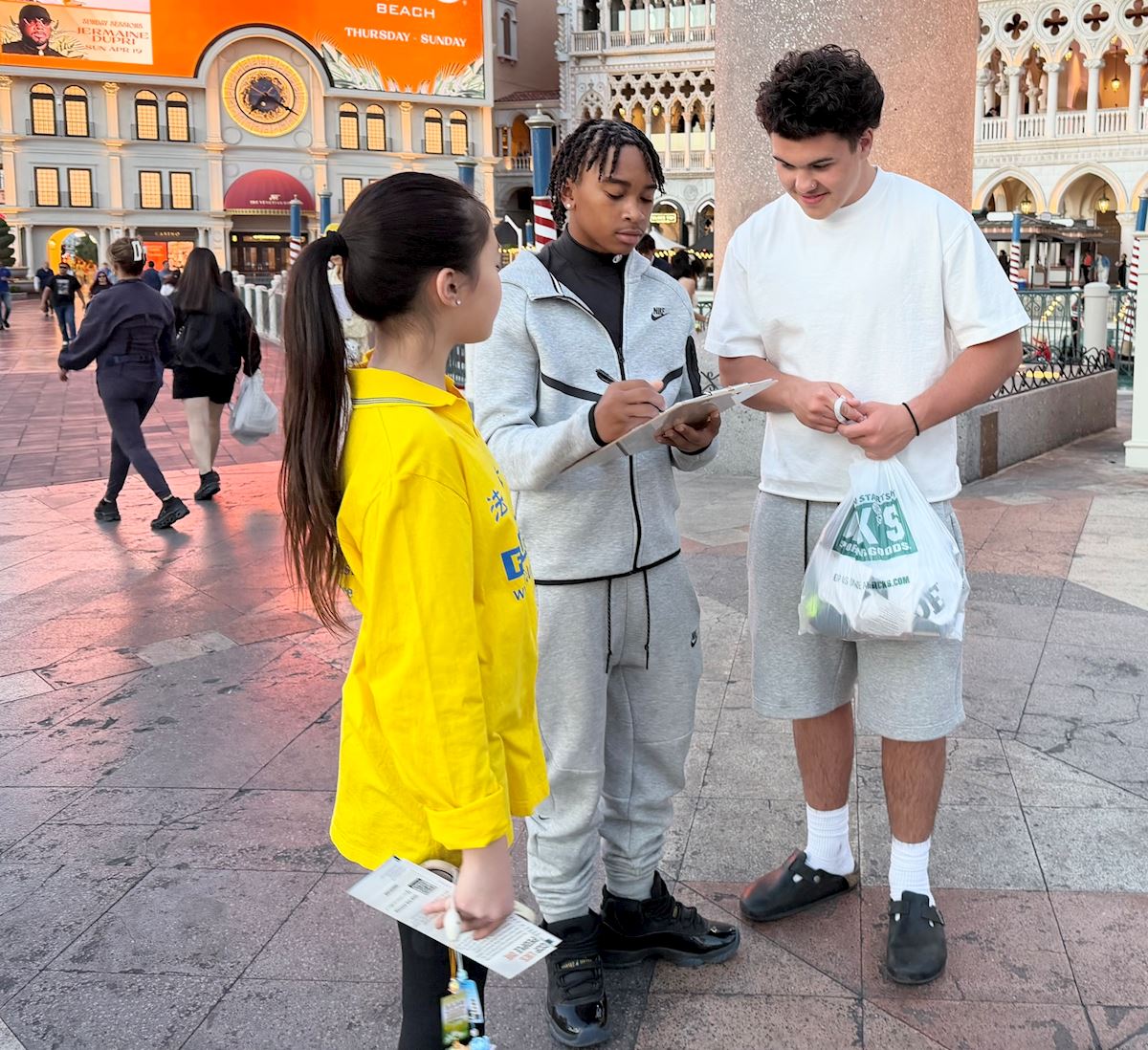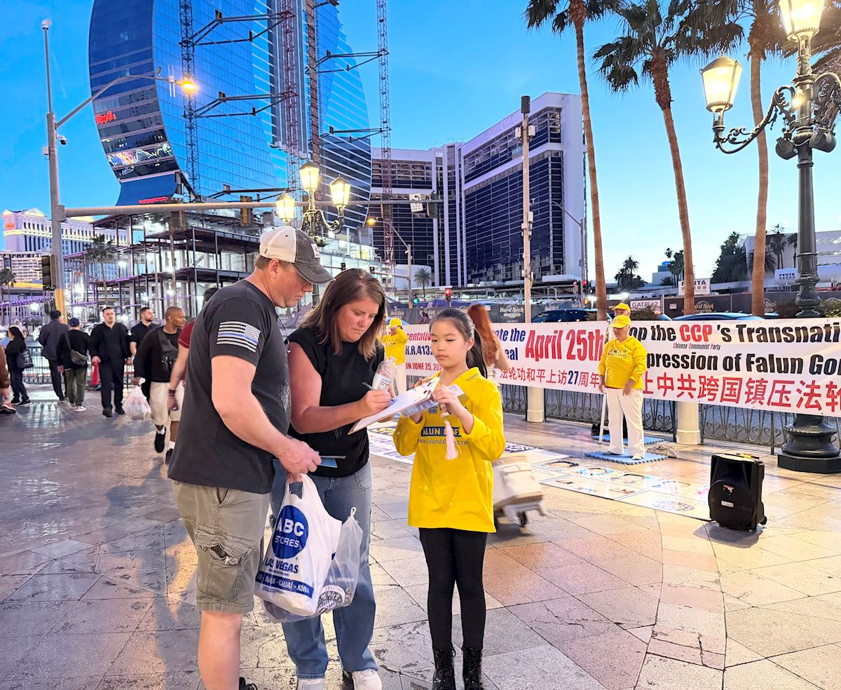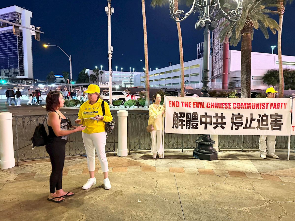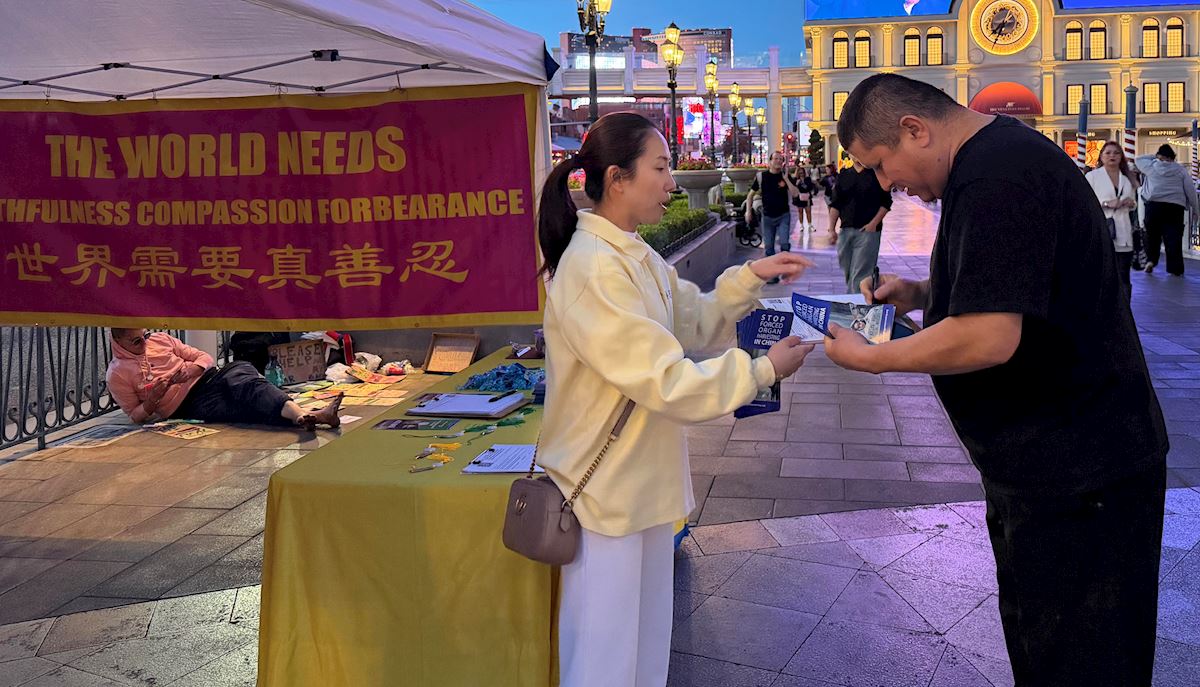 当天傍晚的活动现场,学员们支起帐篷,挂起真相条幅,醒目的文字内容吸引了赌城大道上往来穿梭的人群。他们有的驻足观看;有的接过学员发放的真相传单,和学员交流,了解究竟发生了什么;也有的在征签表上签名,支持学员反迫害。