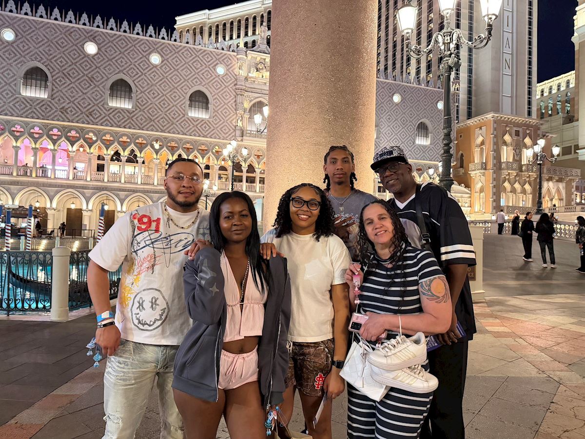 '图1:二零二六年四月十八日傍晚,美国拉斯维加斯部分法轮功学员,在市中心赌场大道威尼斯赌场酒店(The Venetian)前举办活动,纪念二十七年前发生在北京的震惊中外的法轮功学员和平上访事件。'