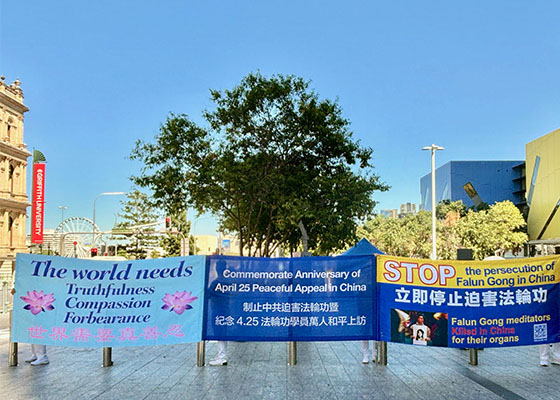 四月十八日,澳洲昆士兰法轮功学员在布里斯班广场举行了集体炼功、横幅展和讲真相活动,纪念四·二五法轮功学员和平上访二十七周年。