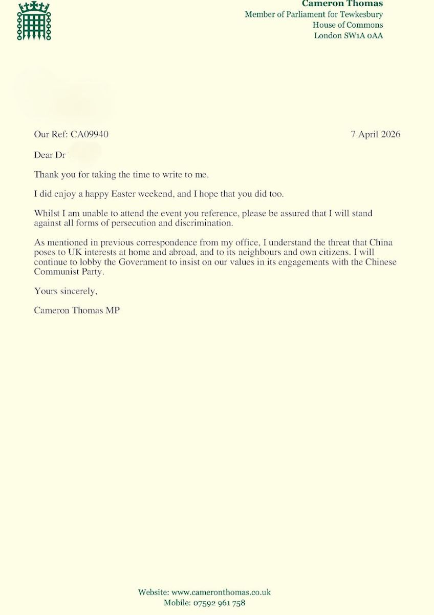 卡梅伦·托马斯 议员(Cameron Thomas MP)在来函中说: