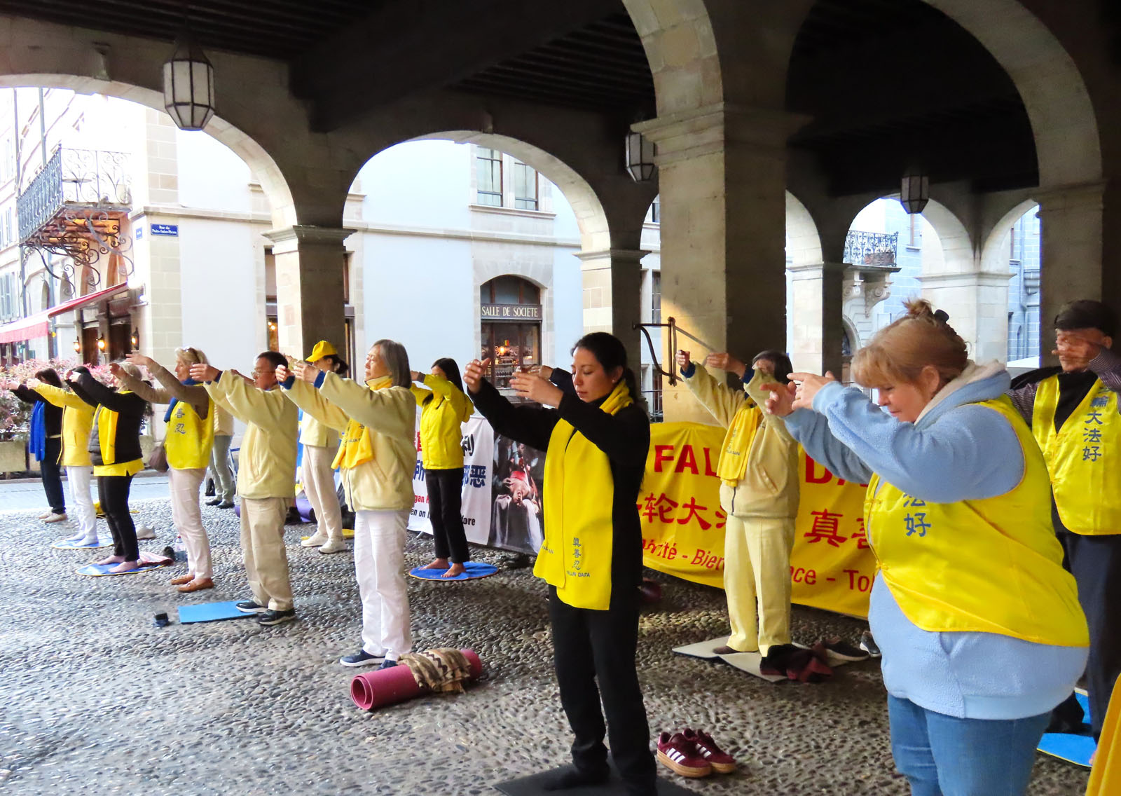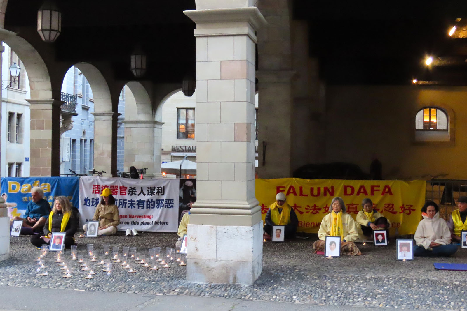 各个年龄段的男女,身着黄蓝相间的服装,在日内瓦老城区标志性的拱廊下平静地打坐。旁边设有请愿签名台和几条横幅,不时有游客驻足询问。
